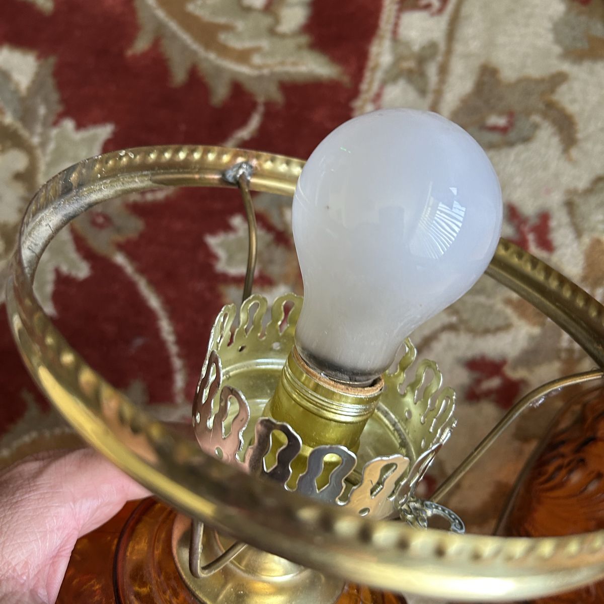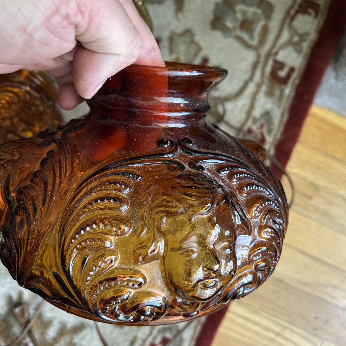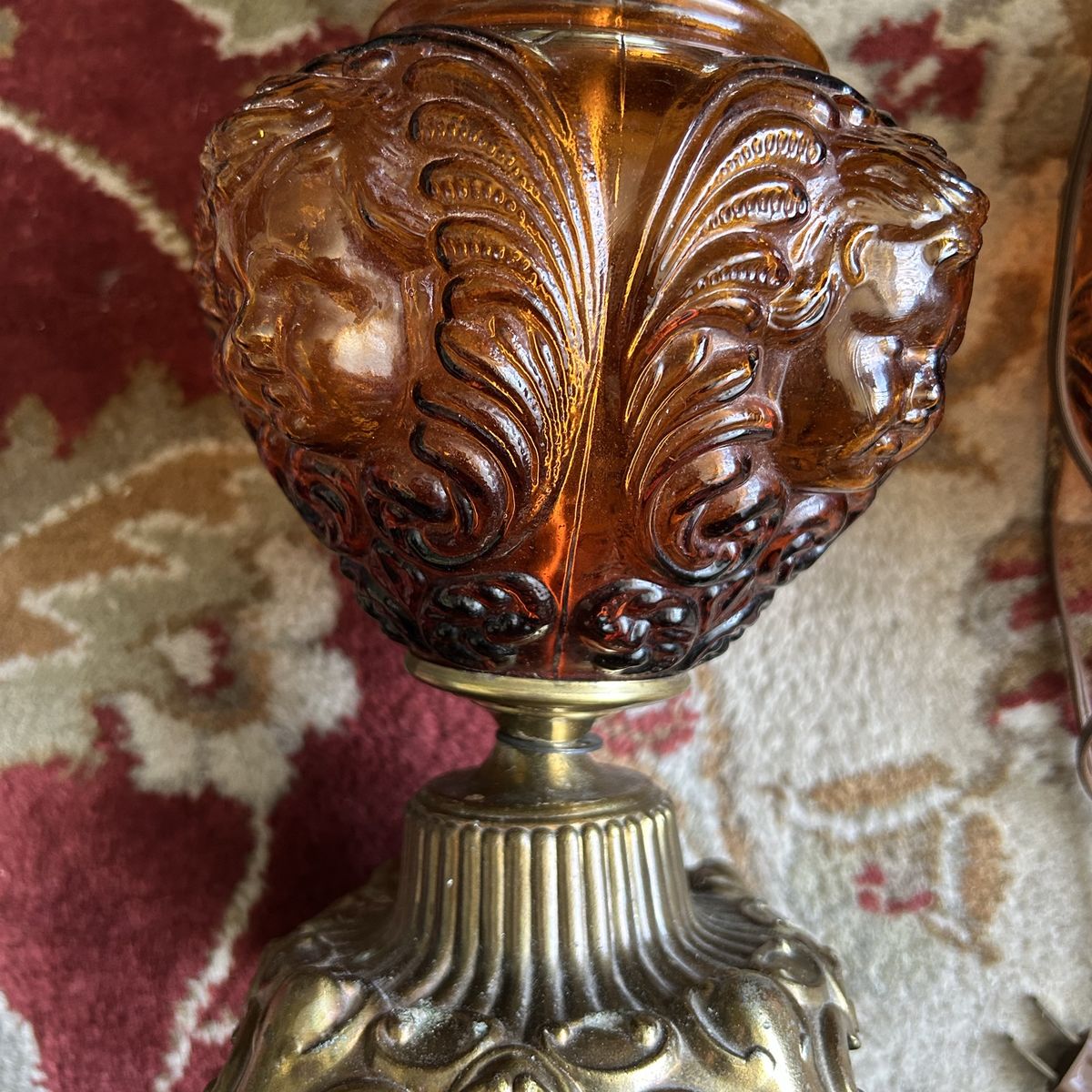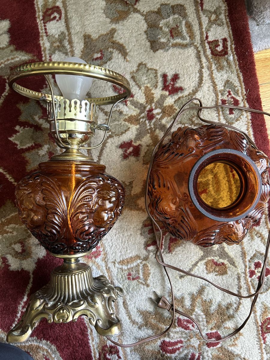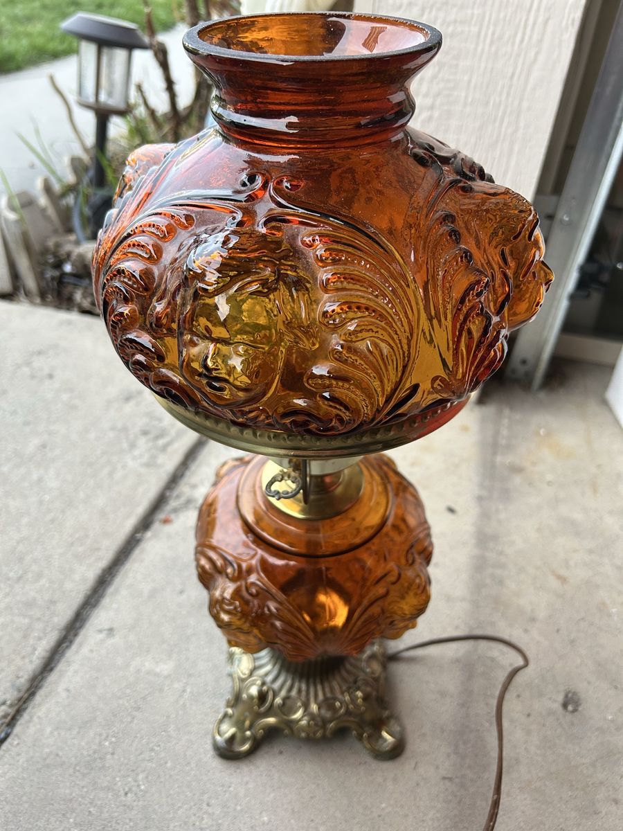 VenmoVintage Fenton Putti Cherubs Amber Colored Electric Lamp With Embossed Glass Shade Measures 20 inches tall with the shade. Nice cosmetic condition, the turn switch turns the light on about half way before it clicks so it could use a new one but works good as is, cash or Venmo only.