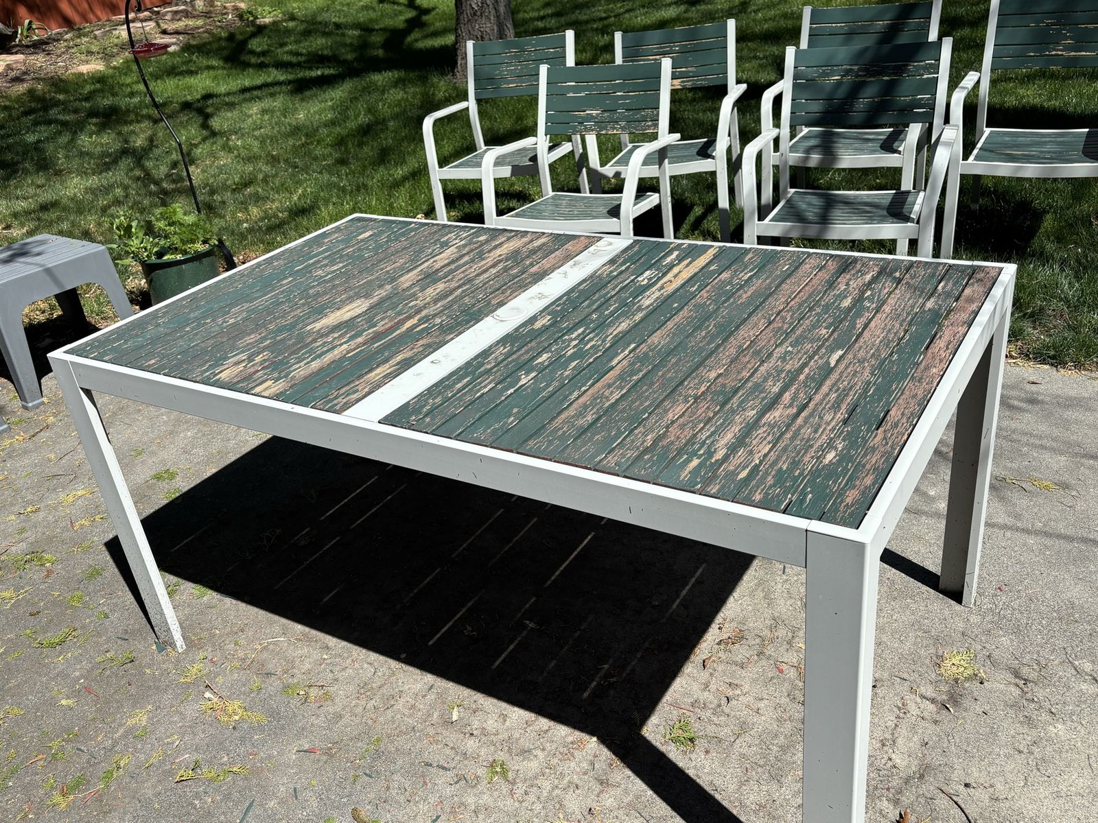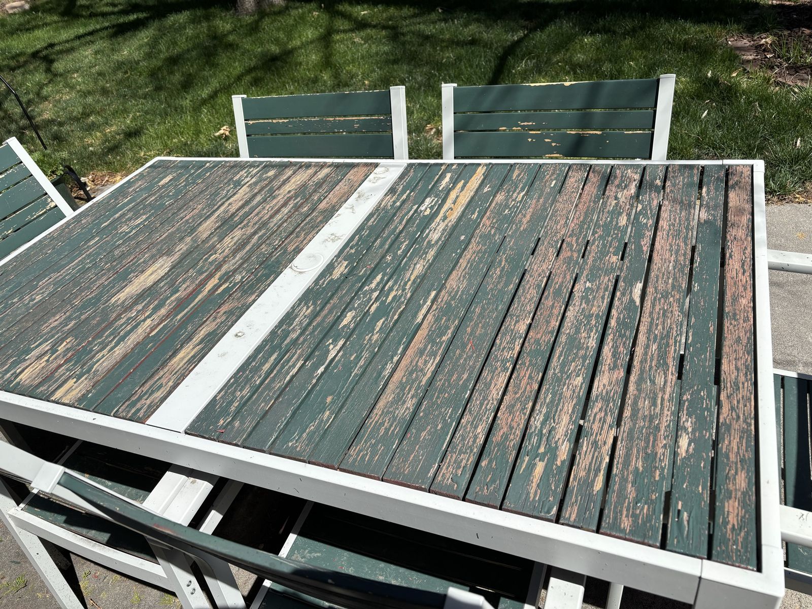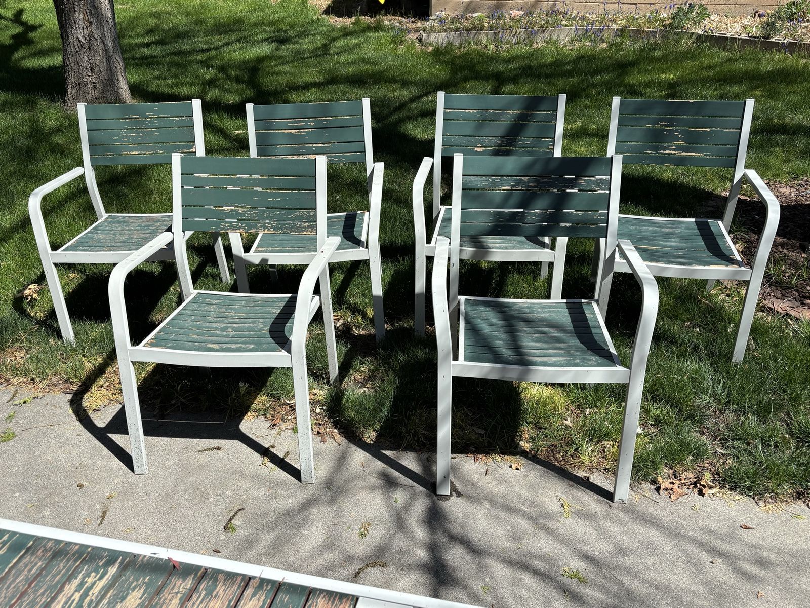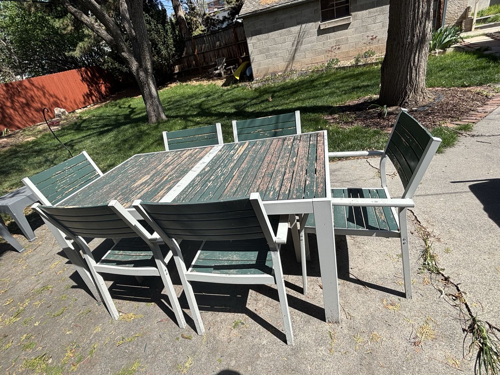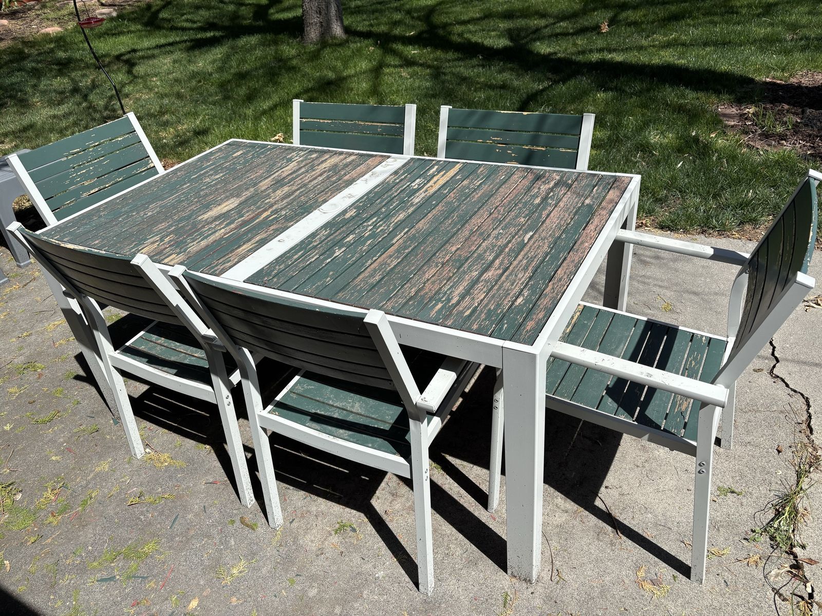 VenmoOutdoor patio table and 6 stackable chairs from the SJÄLLAND series at IKEA. Made of aluminum and eucalyptus. Very sturdy and in good condition, just clearly needs a sanding and fresh coat of paint. I previously used Rust-oleum "Hunt Club Green" in case you want to use the same paint color. Chairs originally $95 per chair. I no longer have the receipt for the original price of the table.