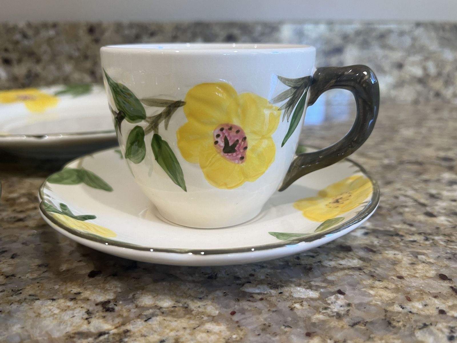 The Meadow Rose pattern features hand-decorated yellow flowers on a white background with scalloped edges. The plates are 10.5 inches across and are all in excellent condition with no chips or cracks. The cup and saucer are in the same condition.