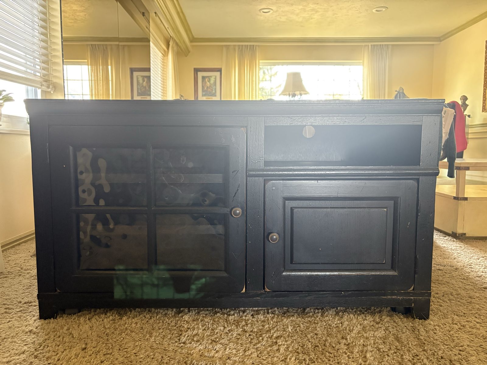 VenmoLike new condition. Black/espresso, light distressed finish. 48“ x 22“. Lots of storage for electronics, etc..