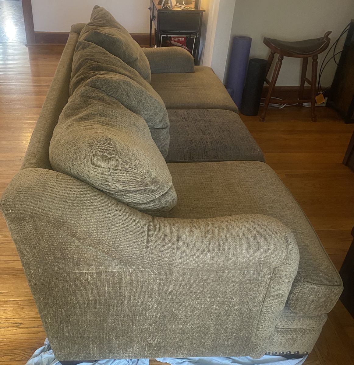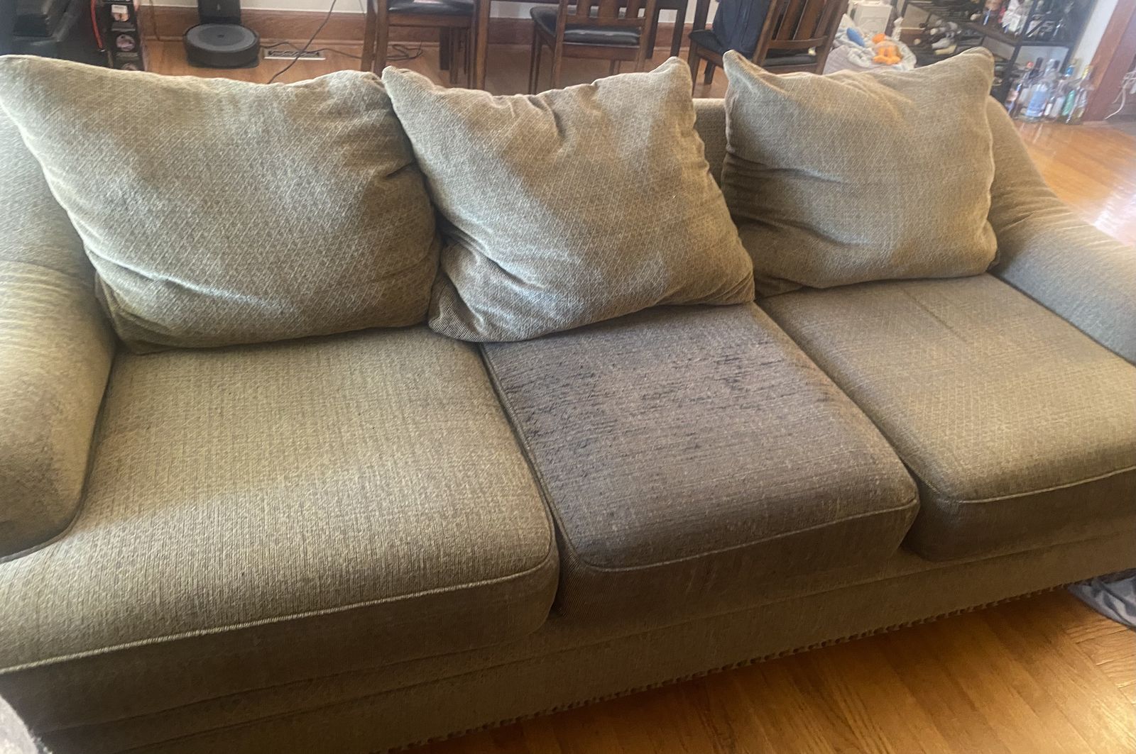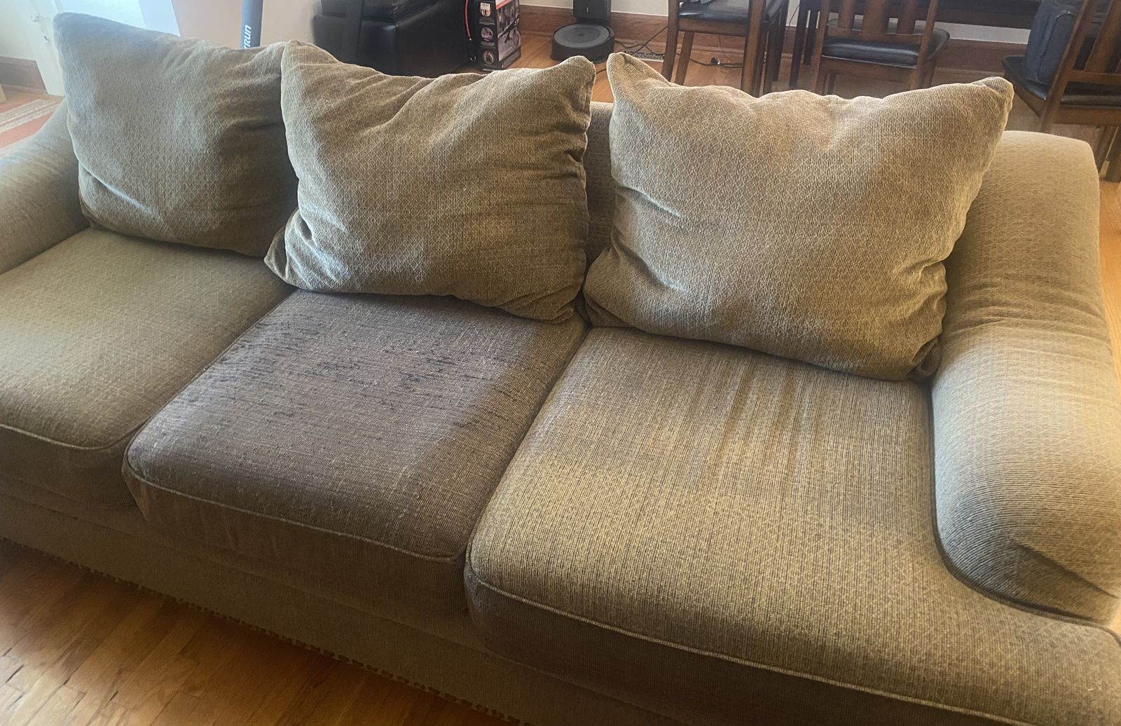 Olive, fabric couch (88" long by 29" high by 39" deep)