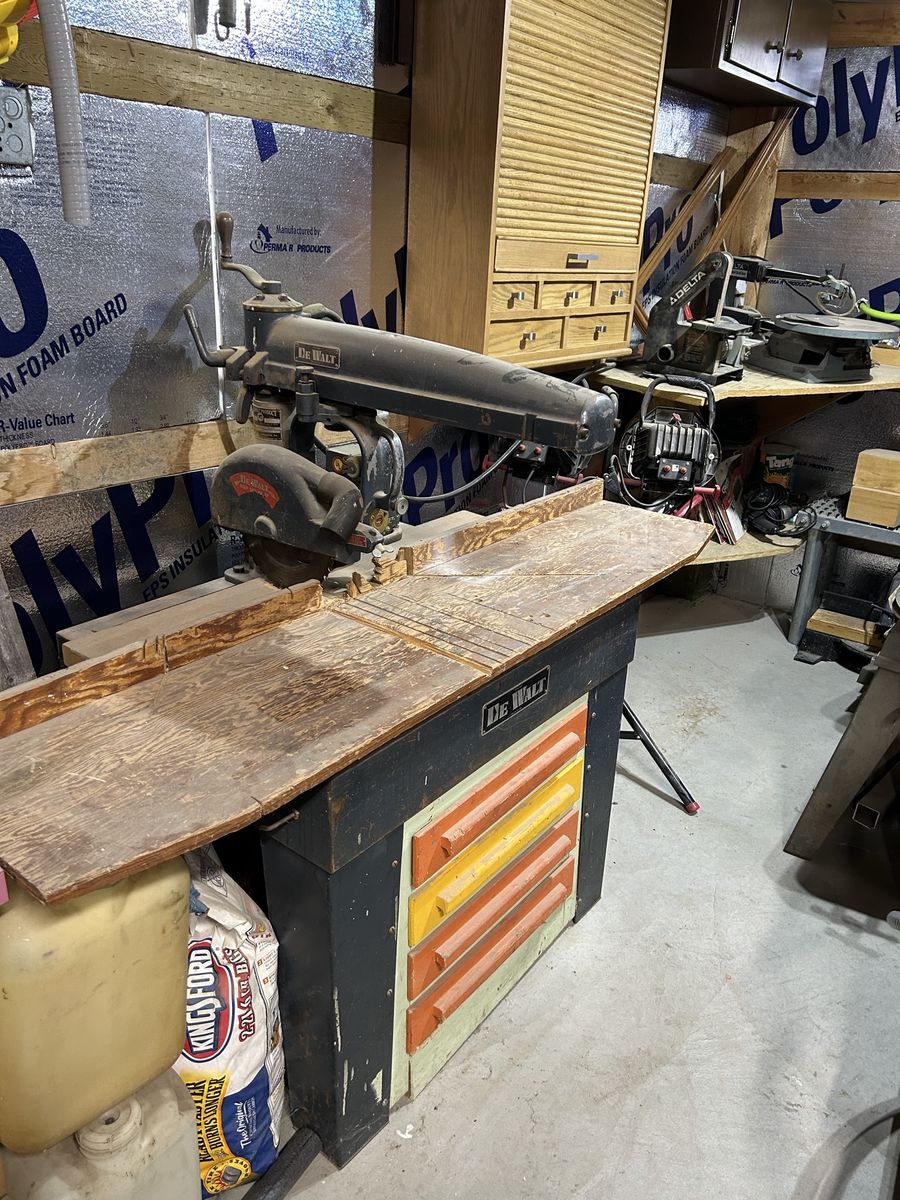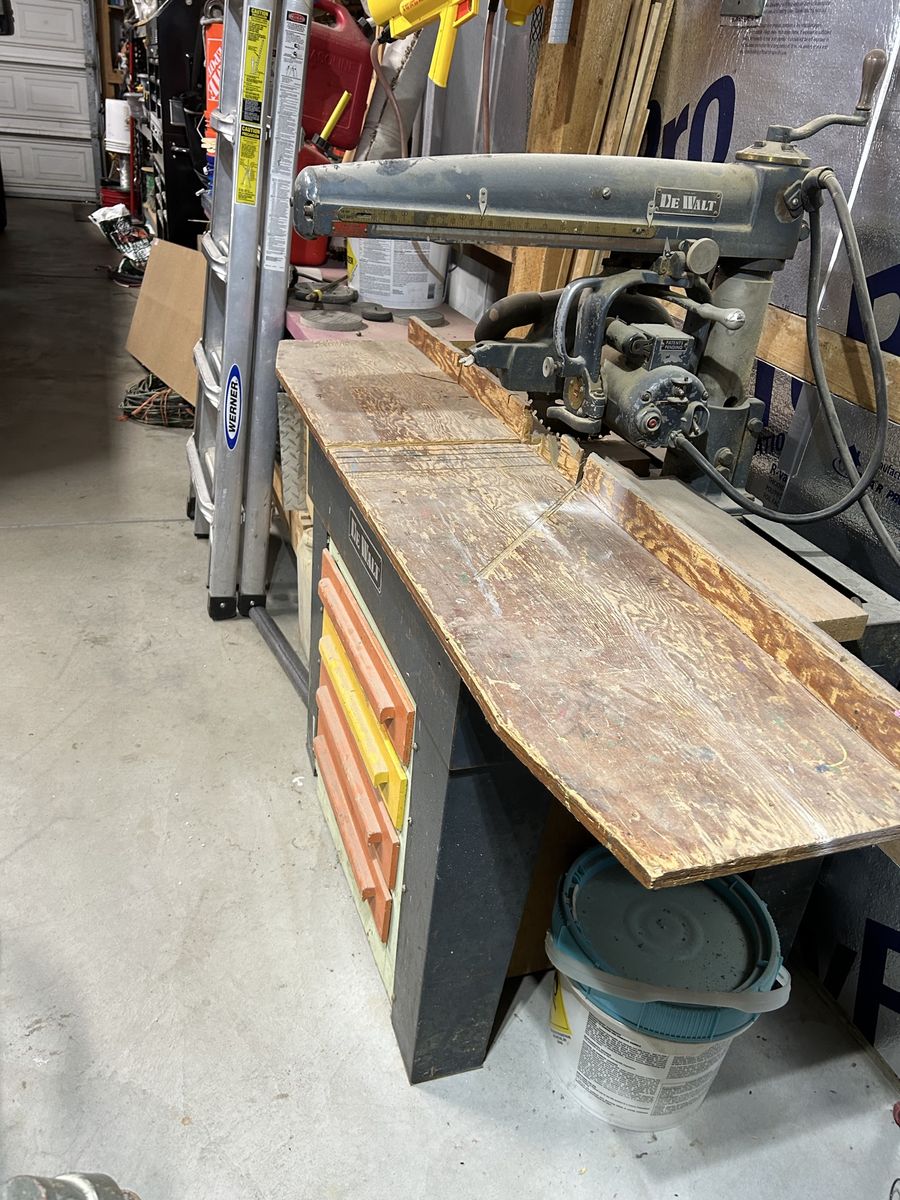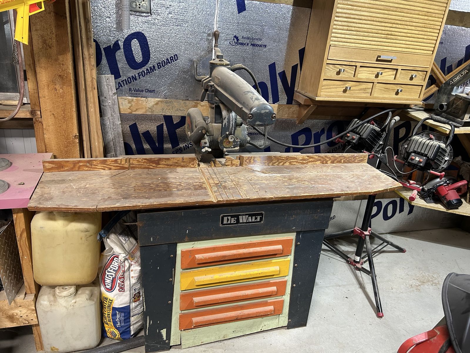 Antique DeWalt radial arm saw. Has custom made shelves added. Can be easily removed if not wanted. Pics show what it is. Asking 500.00 or reasonable offer