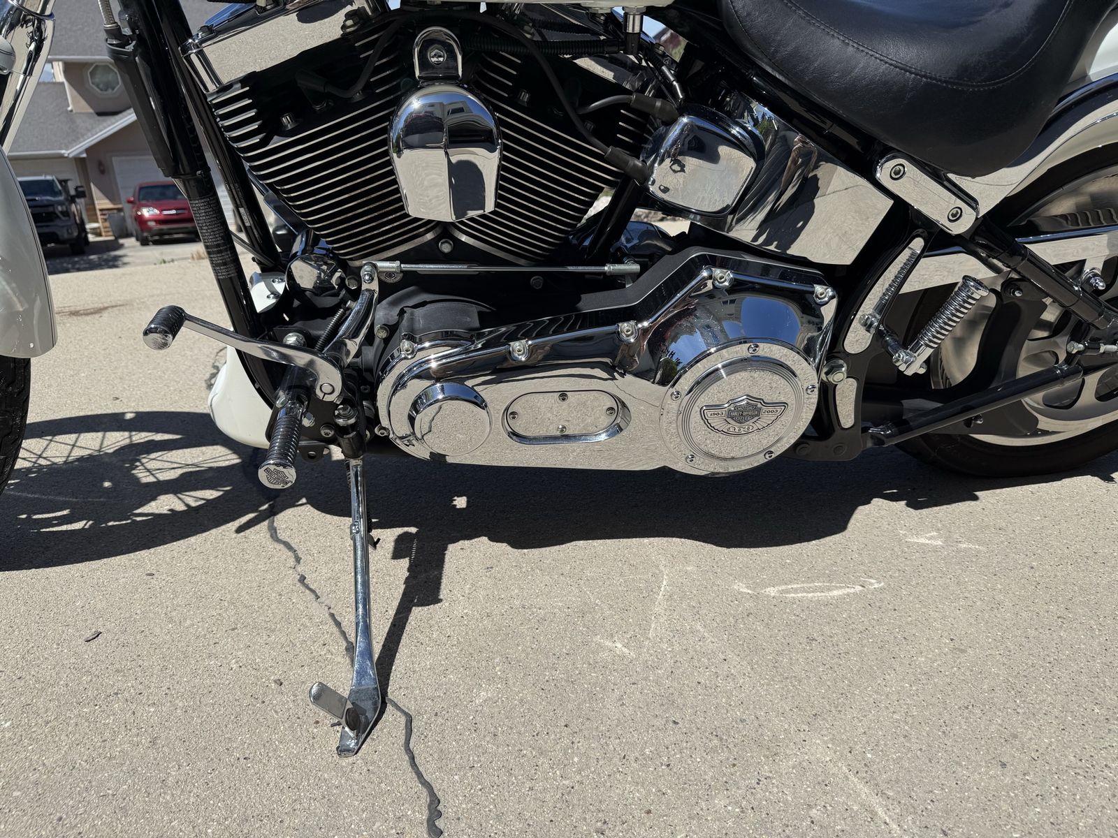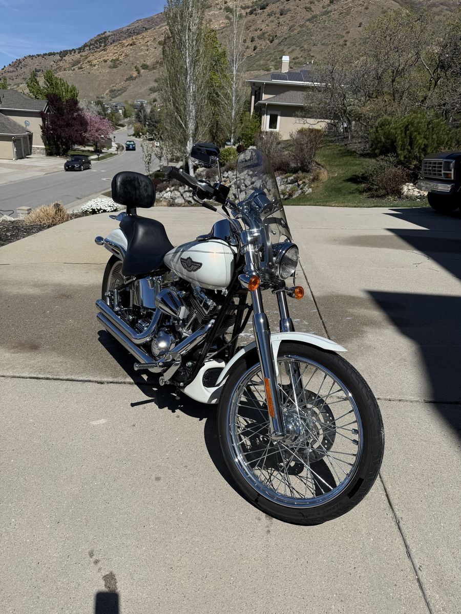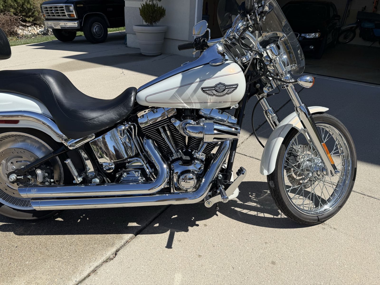 Description: 2003 Harley-Davidson Deuce Softail – 100th Anniversary Edition in pearl white. This is a super clean, low-mileage bike that’s been well cared for and always garage kept.\