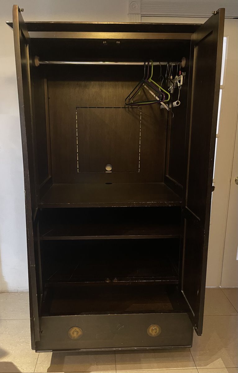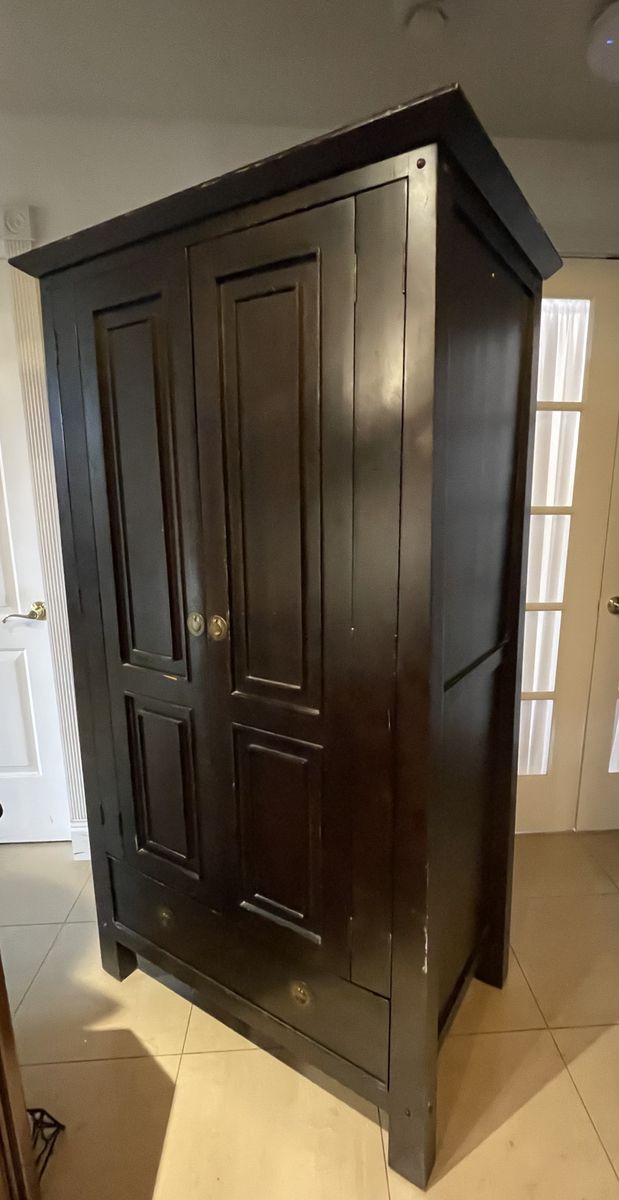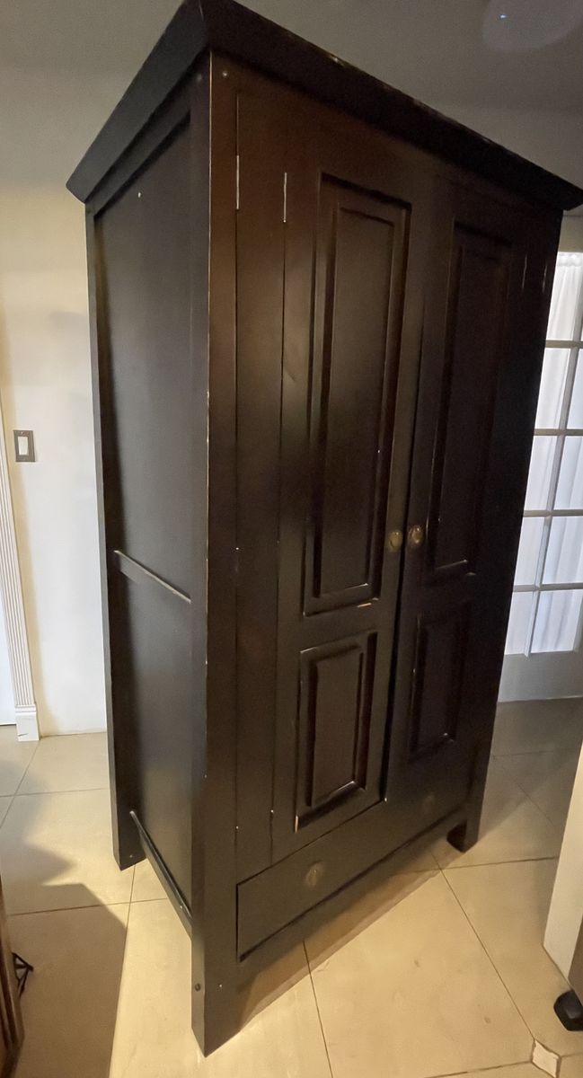 VenmoBeautiful dark wood wardrobe with a classic paneled design. Features two large cabinet doors that open to a roomy interior with a hanging rod and multiple shelves—great for clothing, linens, or storage. Includes a lower drawer for additional space.