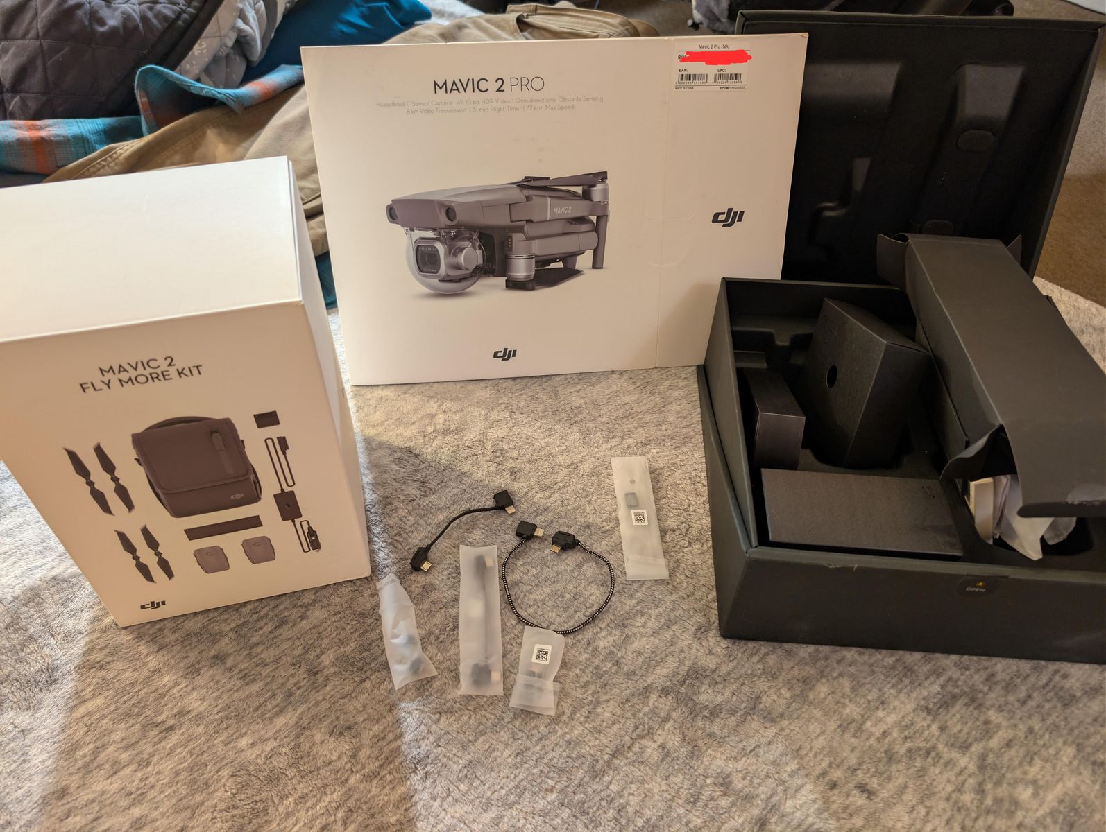 DJI Mavic 2 Pro, RC1A Remote Controller, two healthy batteries, battery charger, battery charging dock (charges up to four batteries), battery car charger, USB-C cable, Micro USB cable, two sets of aftermarket propellers in addition to the original set, a few ND Camera filter/protectors, the carrying case, original boxes, and some additional cables for connecting to devices with Lightning ports.