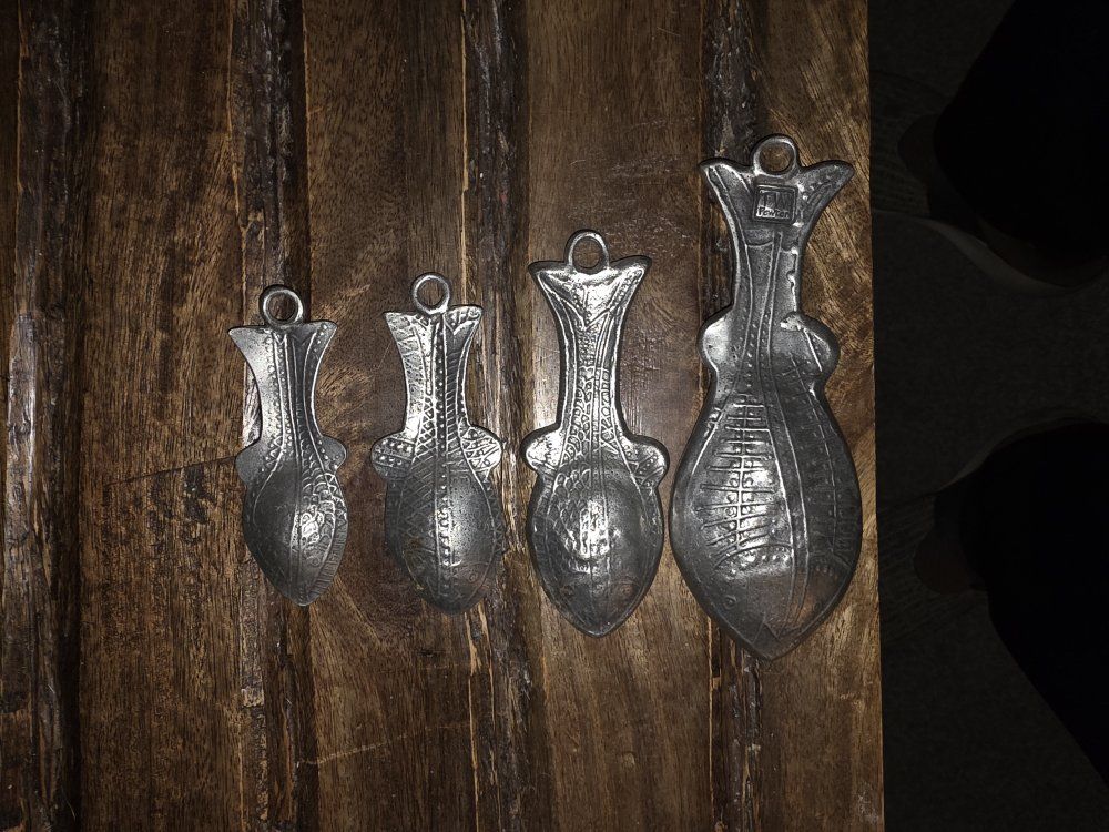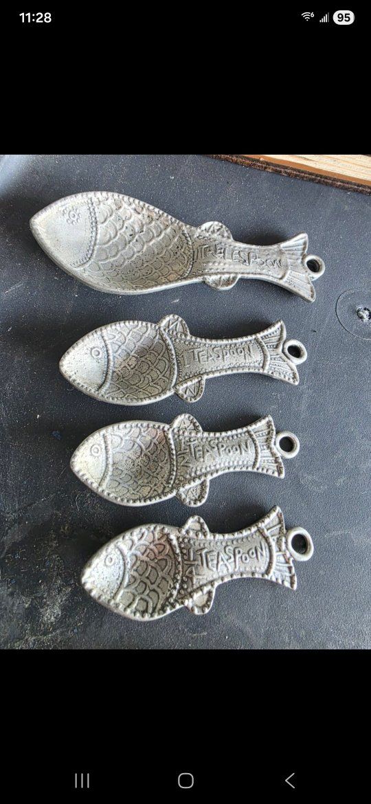ZelleThis is a unique set of ORIGINAL TERRA WEAVER pewter fish measuring spoons. Has four spoons: 1 tablespoon, 1 teaspoon, 1/2 teaspoon, 1/4 teaspoon. Each spoon is shaped like a fish with cool details. Great for kitchen or just for display.