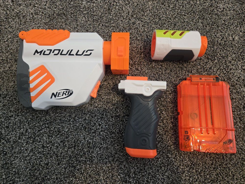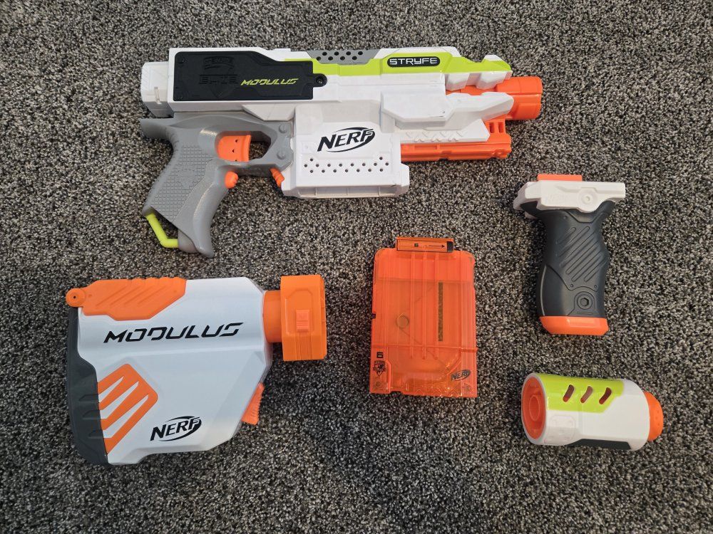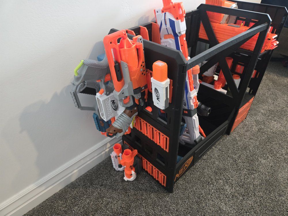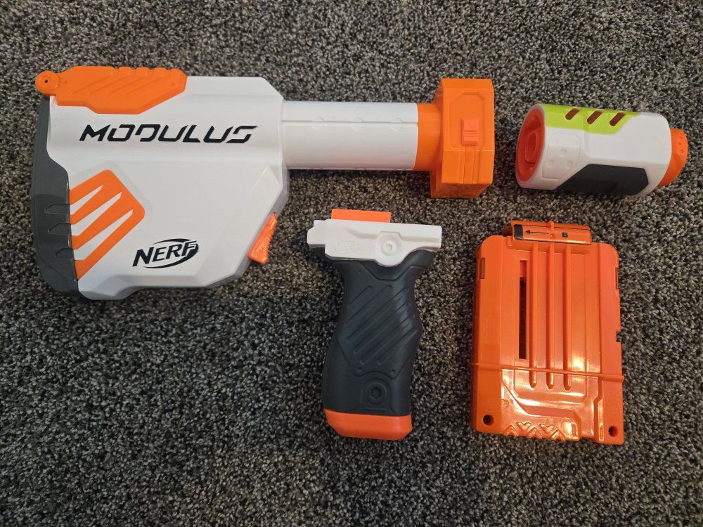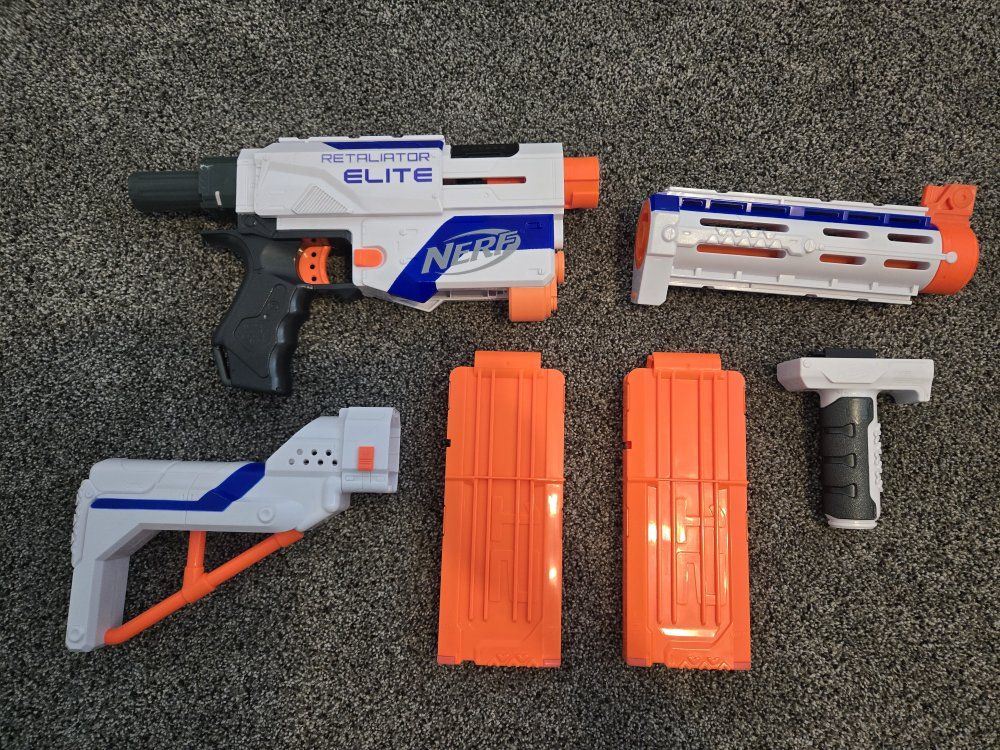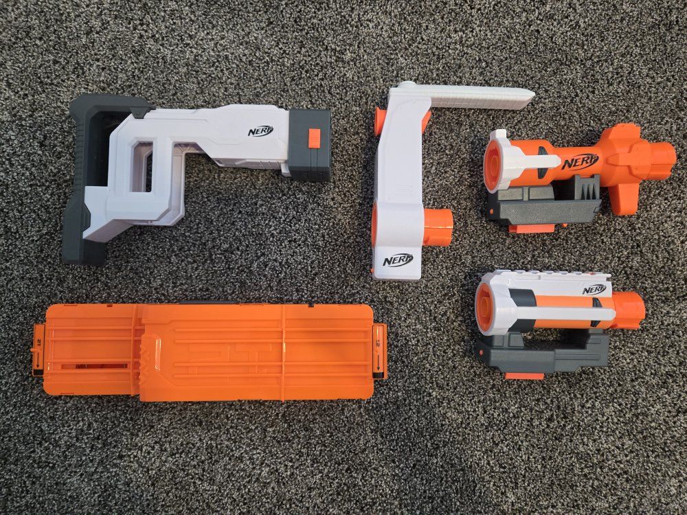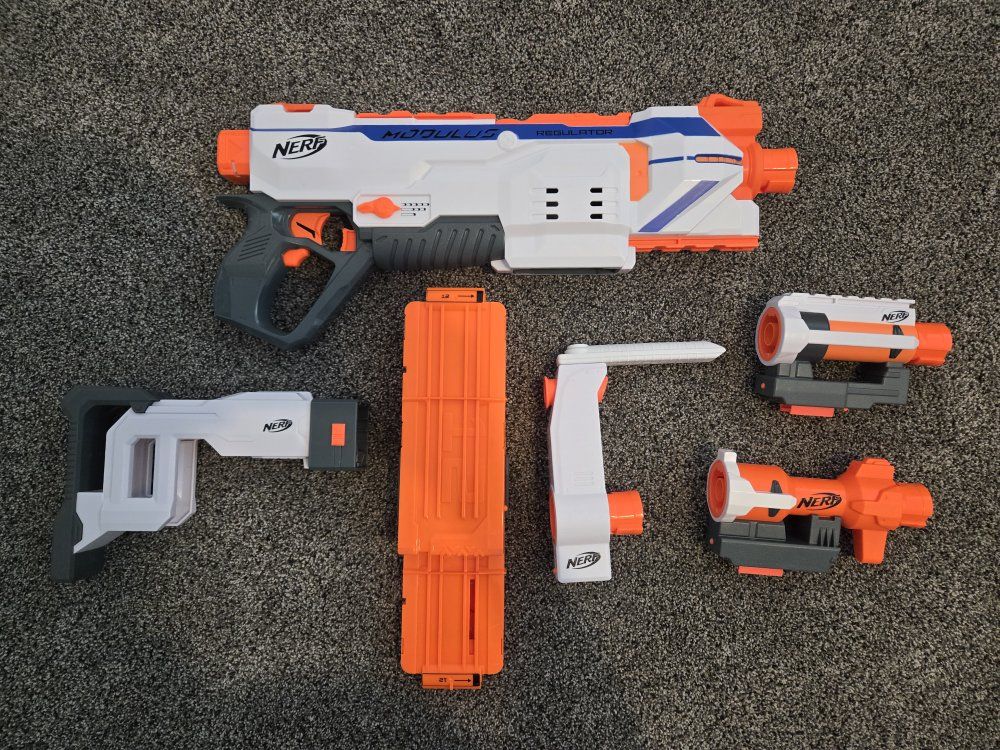 GooglePayPay full price for all or buy separately, prices for separate items listed below. -Nerf Elite 2.0 Eaglepoint: $15 -Nerf Modulus Stryfe: $20 -Nerf Elite Retaliator: $20 -Nerf Elite 2.0 Commander: $5 -Nerf Zombie Strike Hammershot: $15 -Nerf Hyper Fuel-20: $15(separately) / $25(together) -Nerf Regulator: $40 -Nerf 35 round drum: $10 -Nerf Modulus Tactical Light: $10 -Nerf Storage Rack: $40 Each Nerf gun comes with the included attachments out of box. All items work great, and are basically new as they were rarely used.