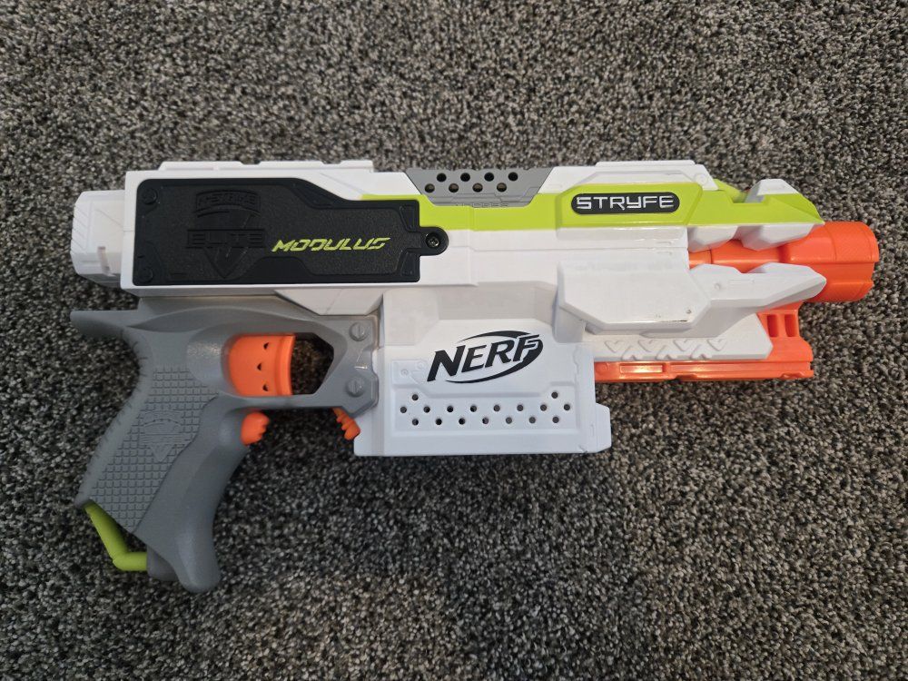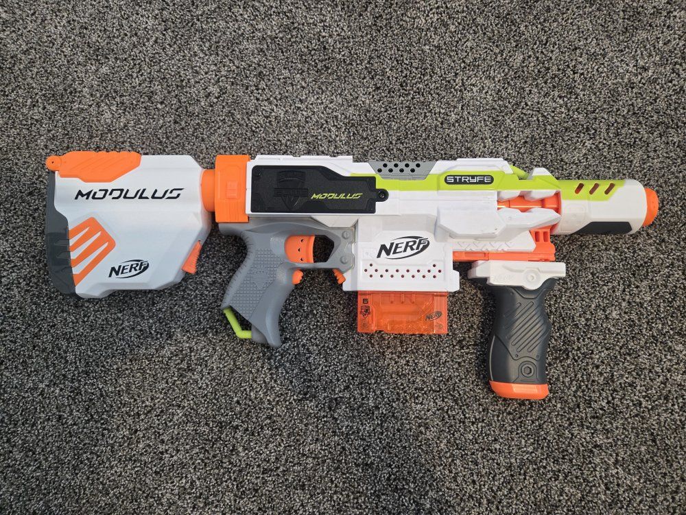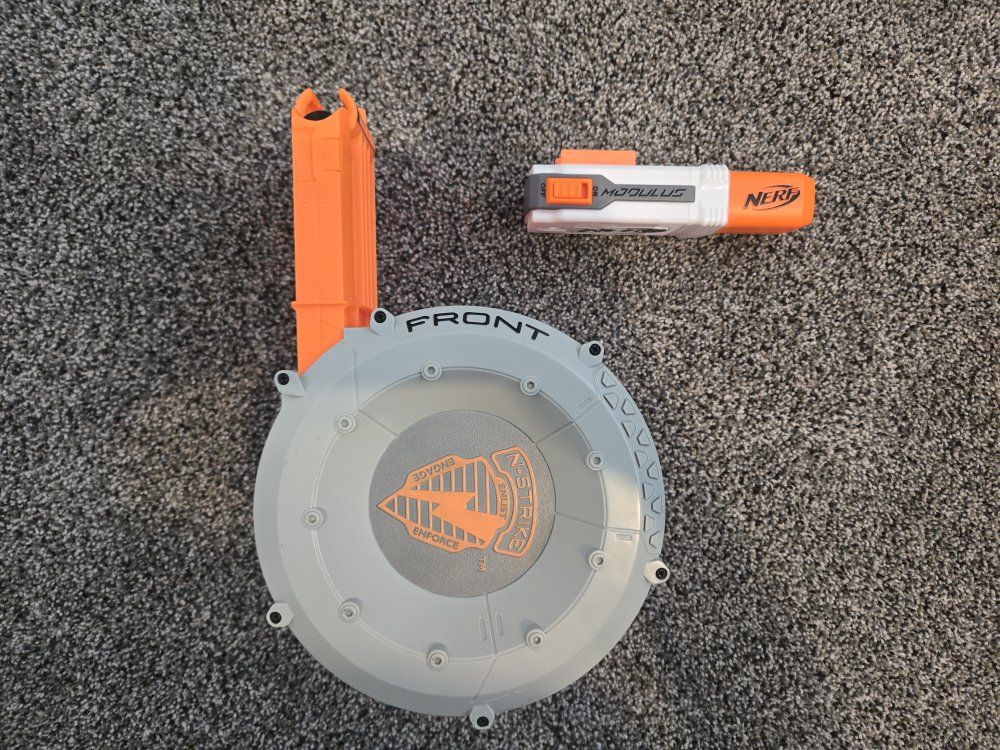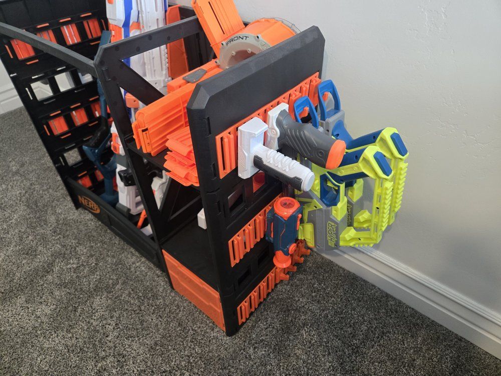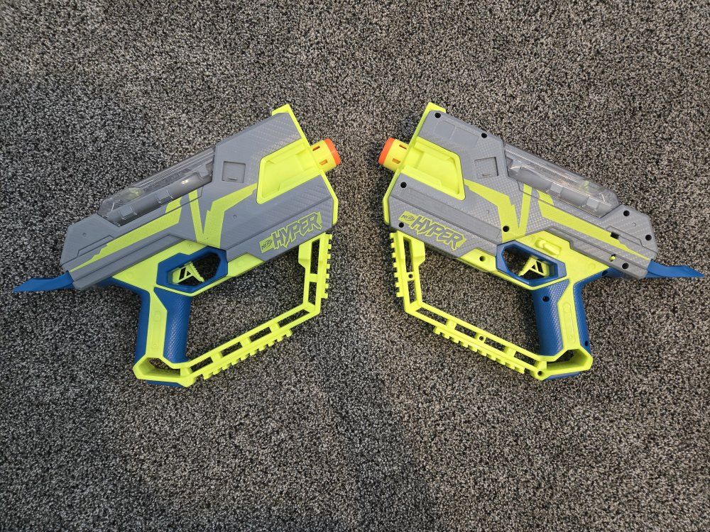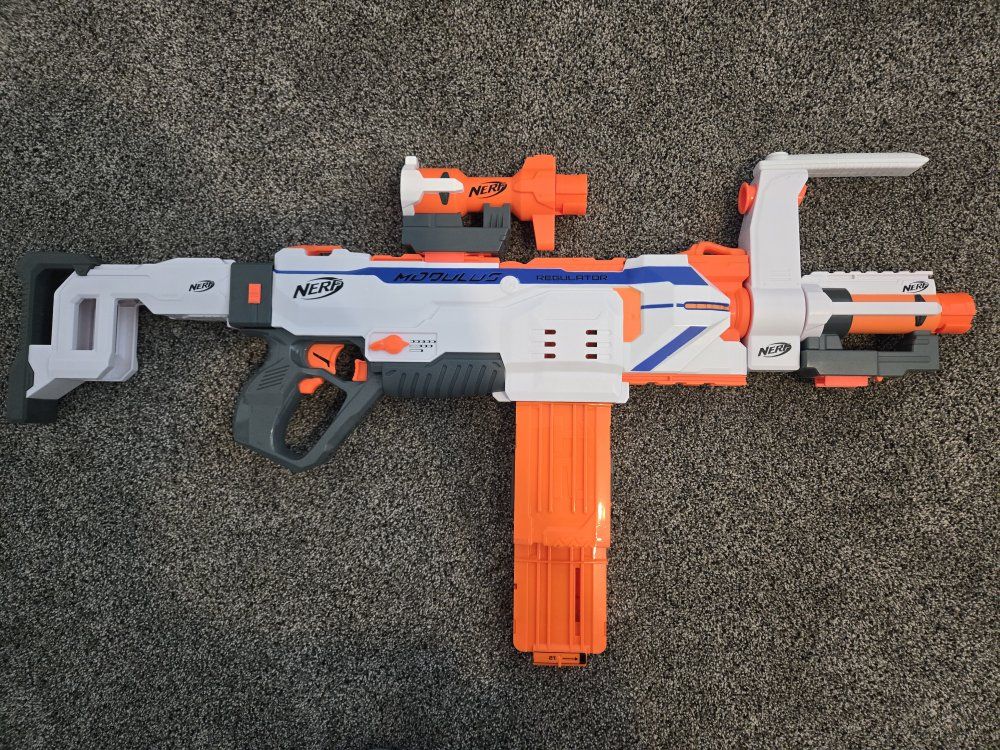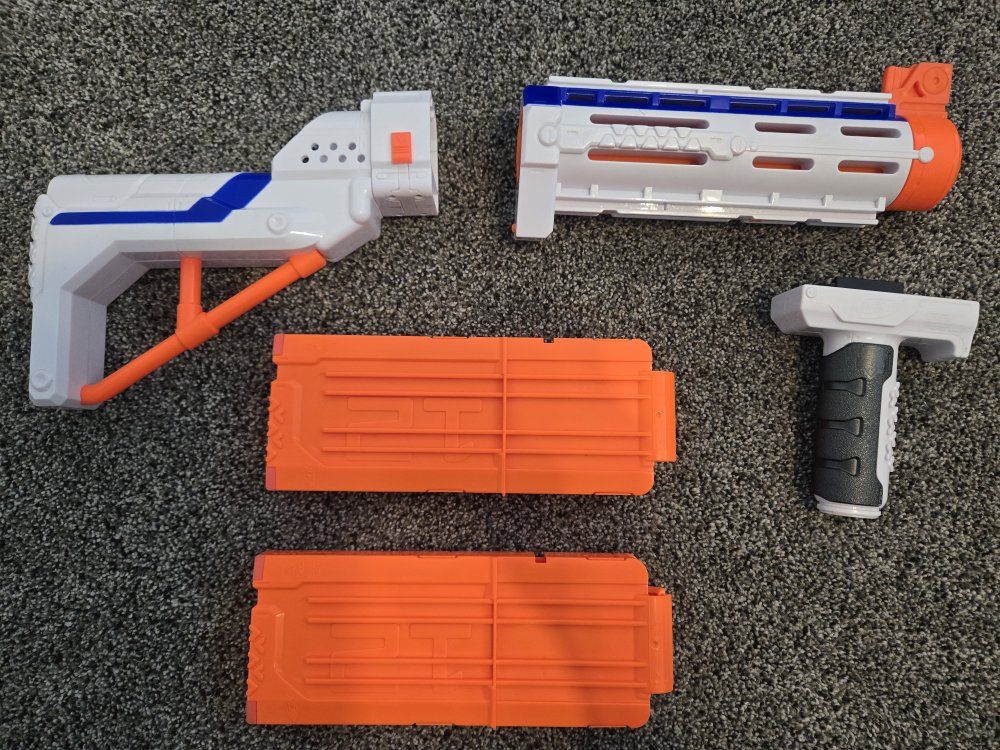 GooglePayPay full price for all or buy separately, prices for separate items listed below. -Nerf Elite 2.0 Eaglepoint: $15 -Nerf Modulus Stryfe: $20 -Nerf Elite Retaliator: $20 -Nerf Elite 2.0 Commander: $5 -Nerf Zombie Strike Hammershot: $15 -Nerf Hyper Fuel-20: $15(separately) / $25(together) -Nerf Regulator: $40 -Nerf 35 round drum: $10 -Nerf Modulus Tactical Light: $10 -Nerf Storage Rack: $40 Each Nerf gun comes with the included attachments out of box. All items work great, and are basically new as they were rarely used.