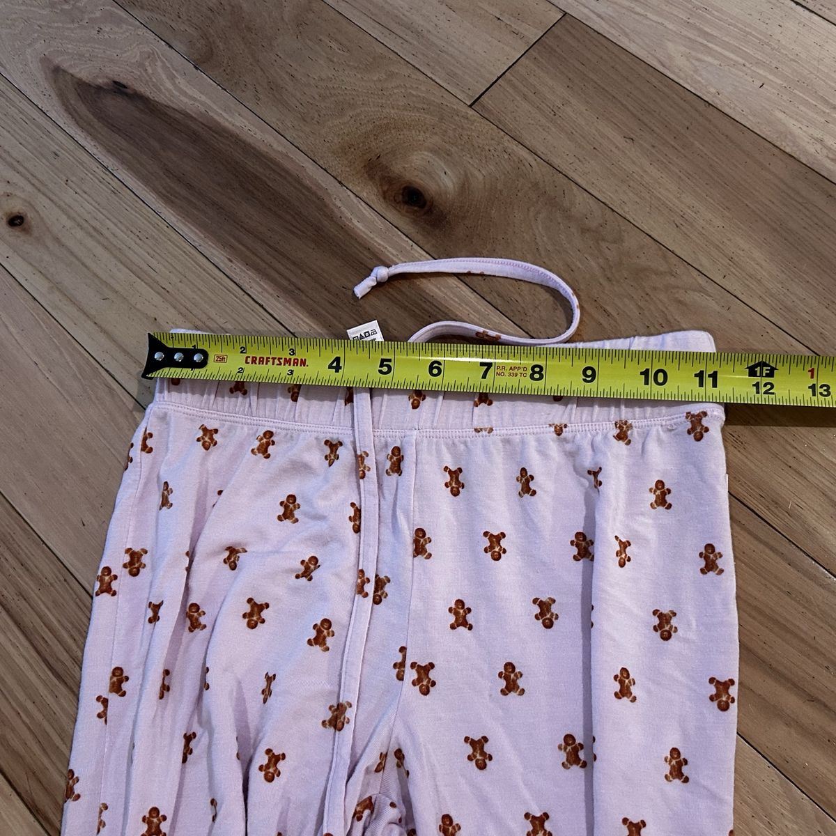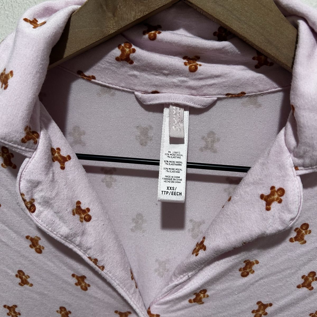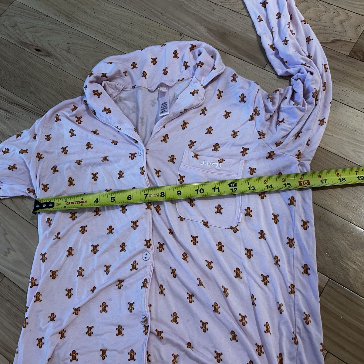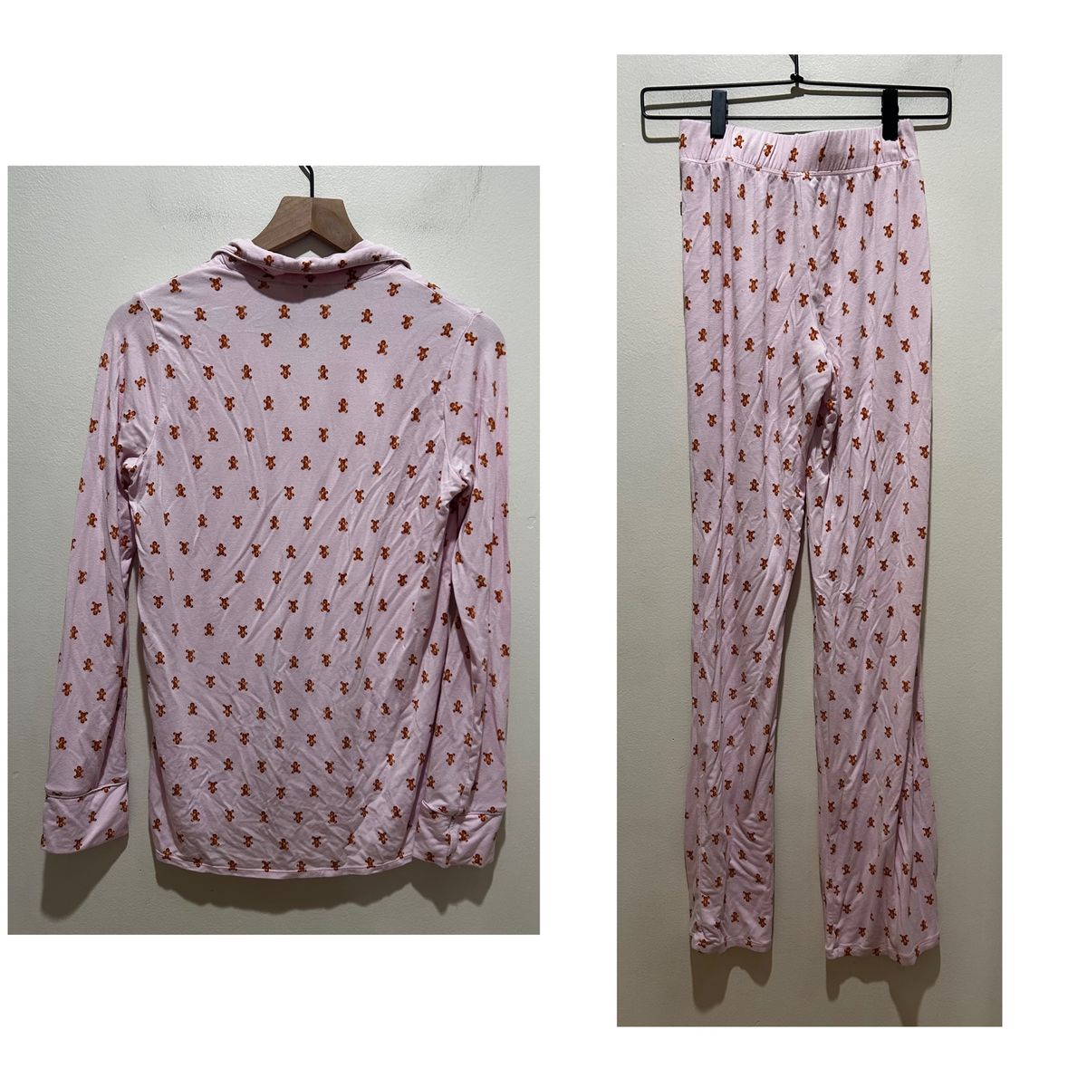 Skims Light Pink with Gingerbread Man Print 2-Piece Pajama Set - includes pull on style pants with elastic waistband and tie and long sleeve button front shirt - Women’s Size XXS - super soft and comfy - does show some minor signs of wear (some minor pilling) - pre-owned.