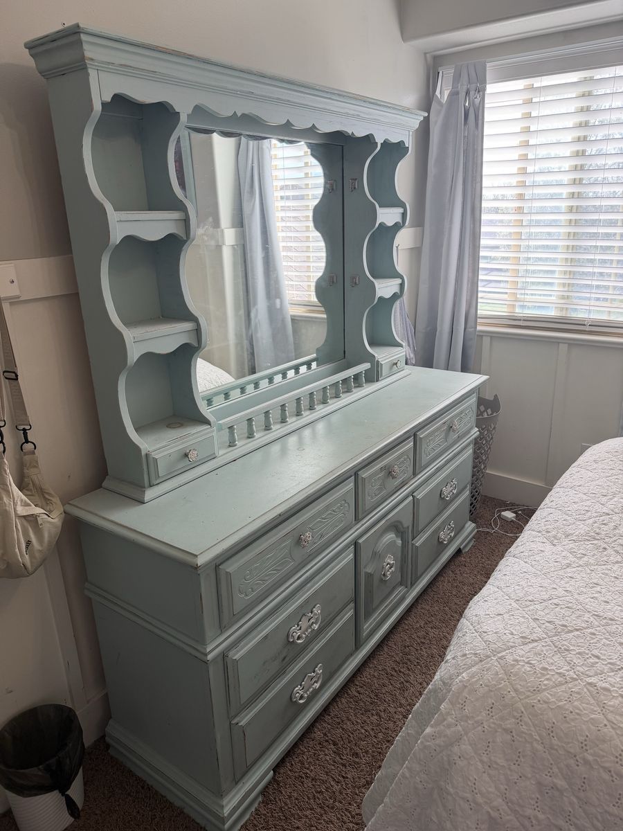VenmoDresser is 68“ wide 31“ tall 73” tall with mirror 19“ deep Has 7 drawers and small cupboard with 2 additional drawers. There are 2 small drawers on the mirror and 6 small shelves