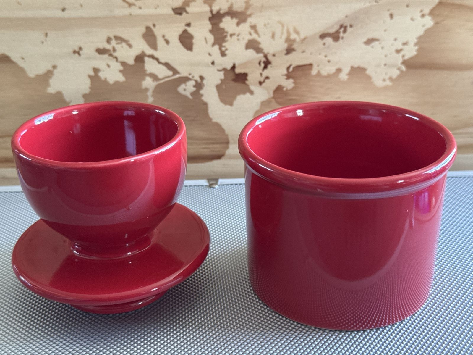 Design: A red ceramic container with an inverted bell-shaped lid that creates a water seal.