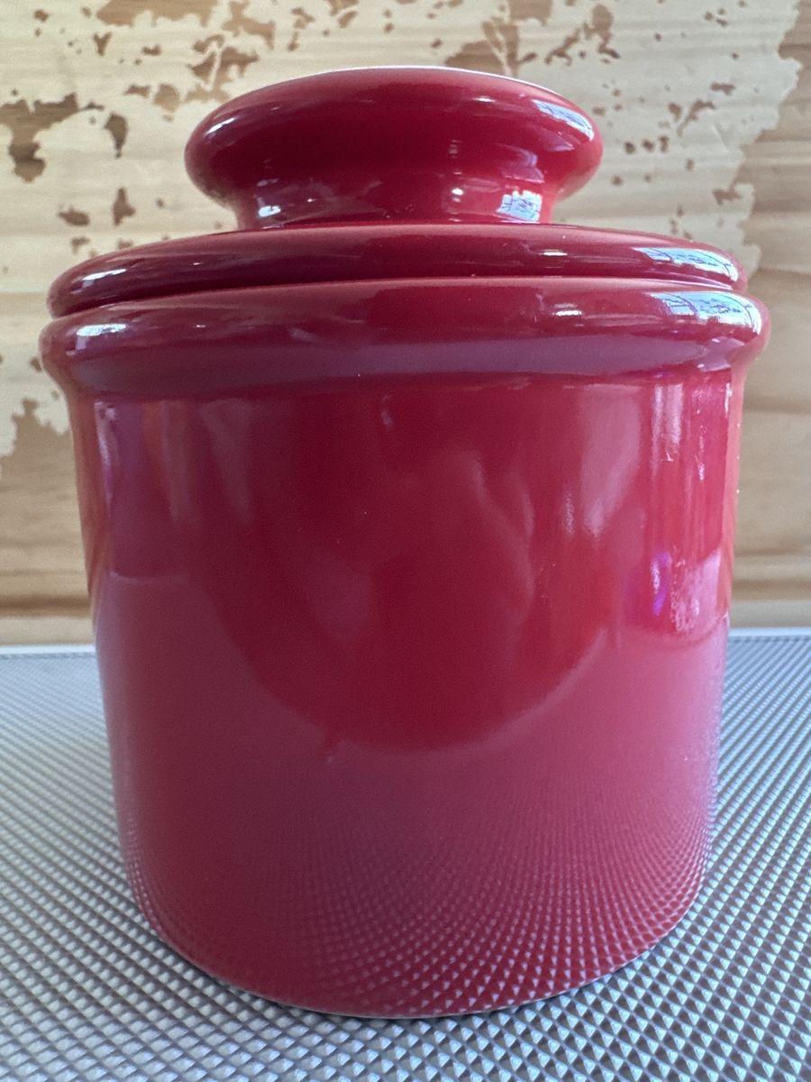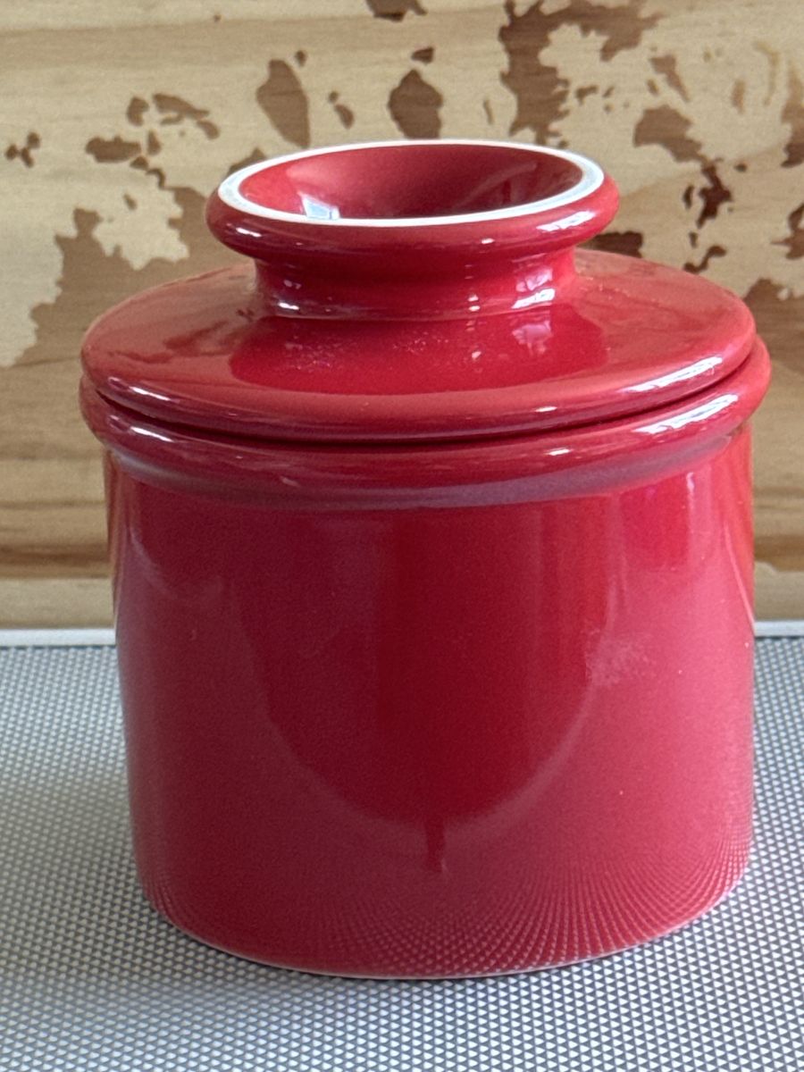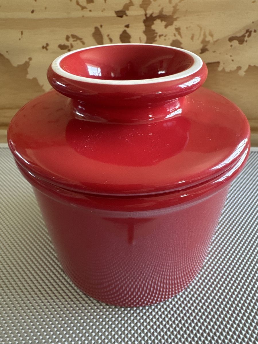 VenmoButter Bell Crock, specifically a 2-piece ceramic butter keeper with a vibrant red glaze and a white rim, $9