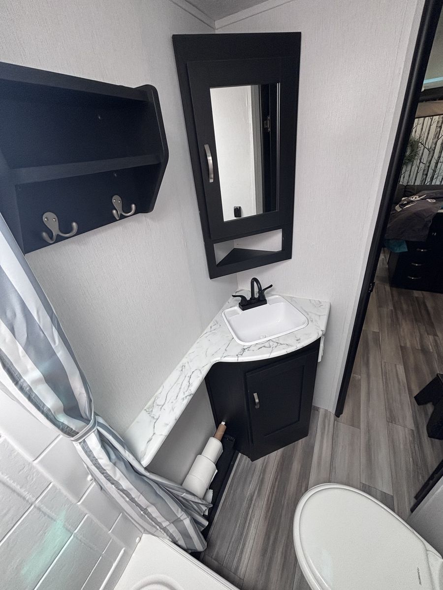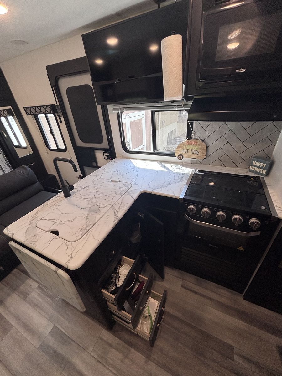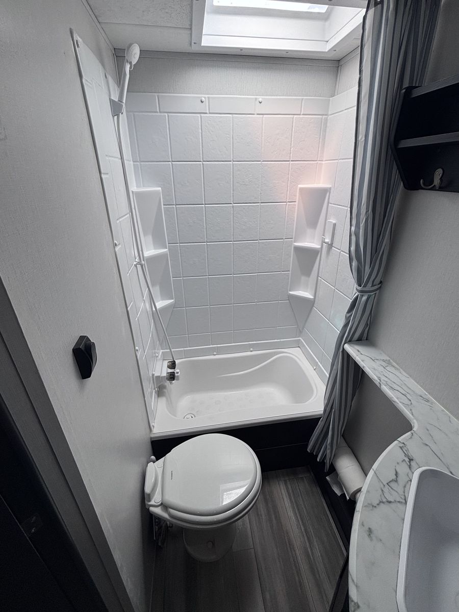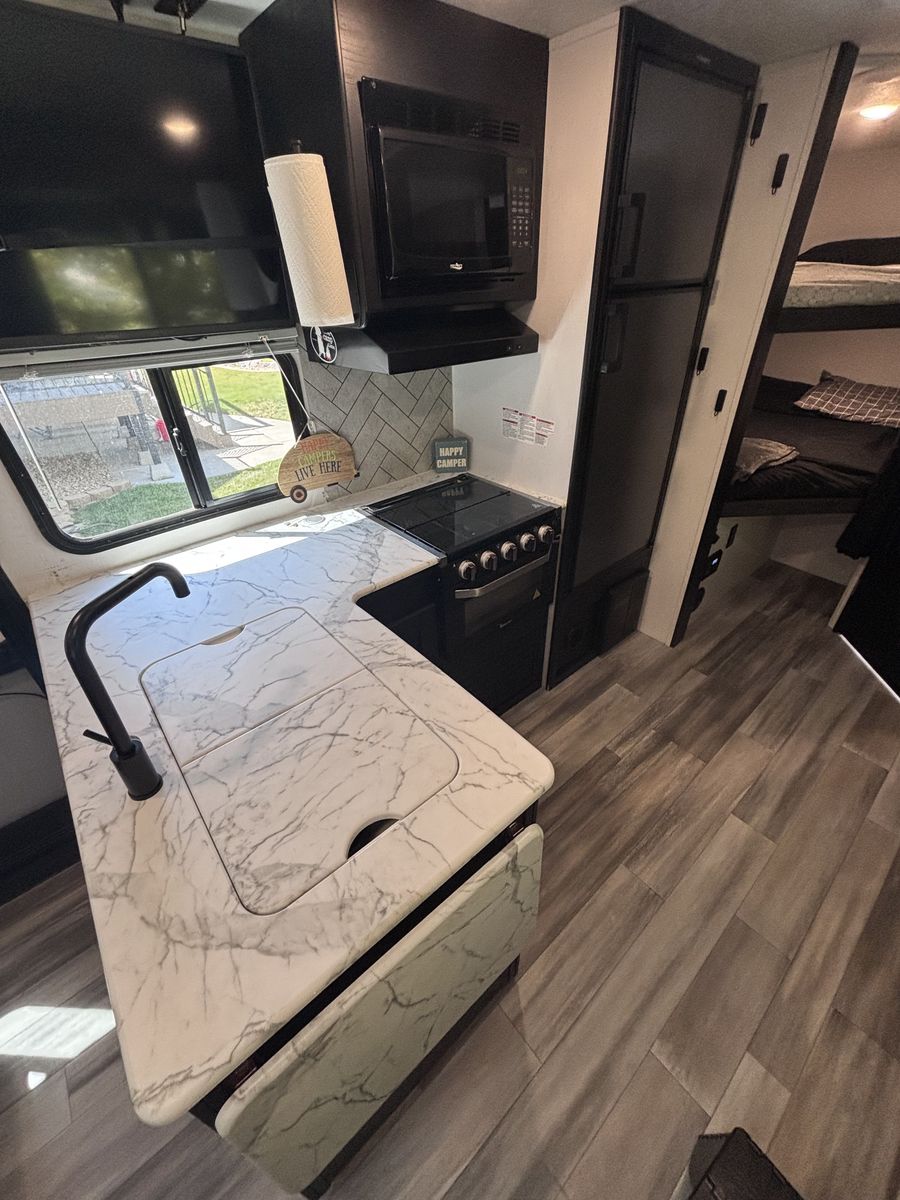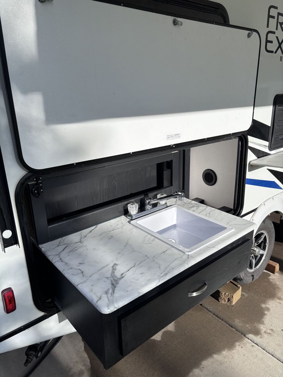 ** • Bathtub + outdoor shower – rare find in this size trailer**