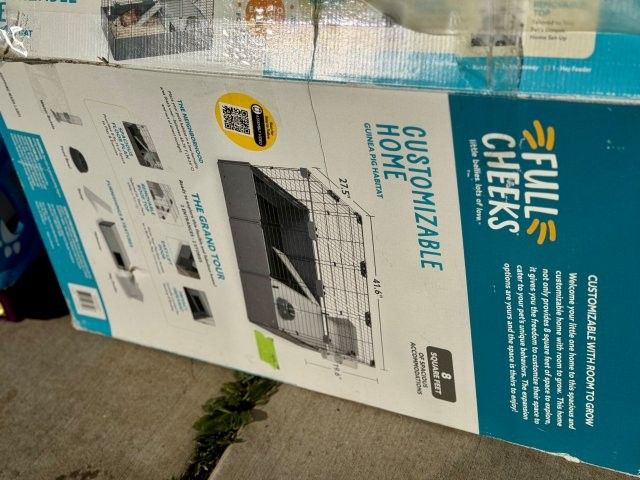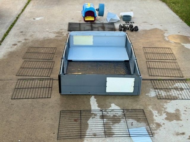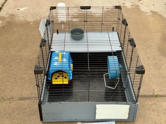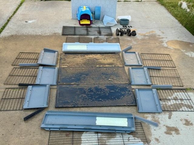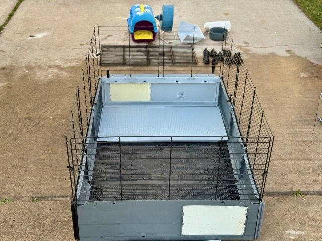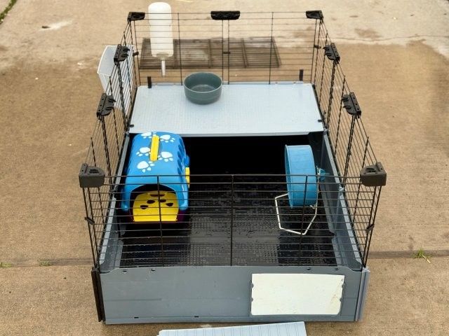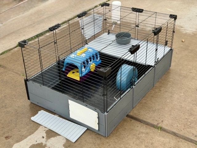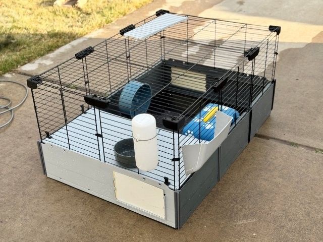 8 square feet of space in this 47"L x 24"W x 14"H habitat. This modular home includes hideout, wheel, and feeding accessories. Removable roof for quick cleaning. Please note that the unit is currently taken down for easy transport and requires assembly.