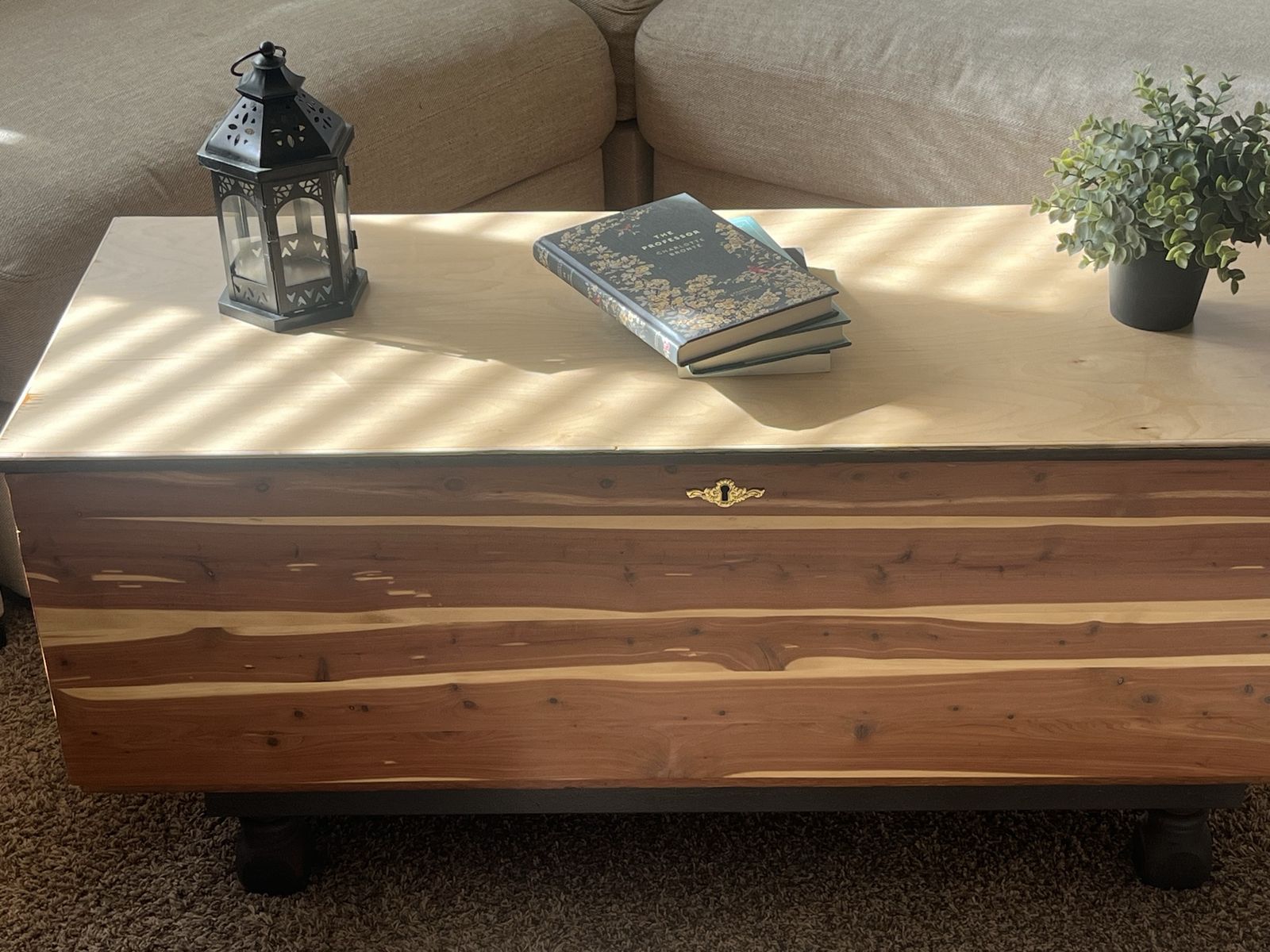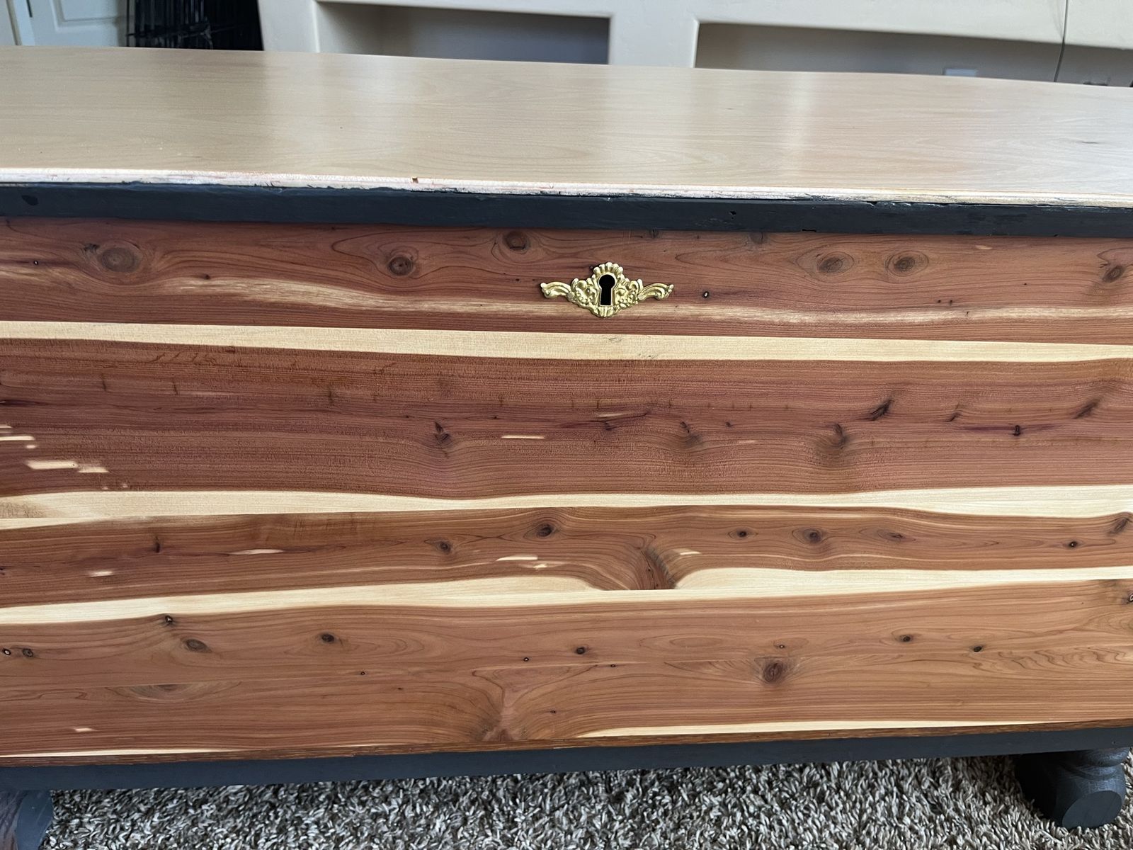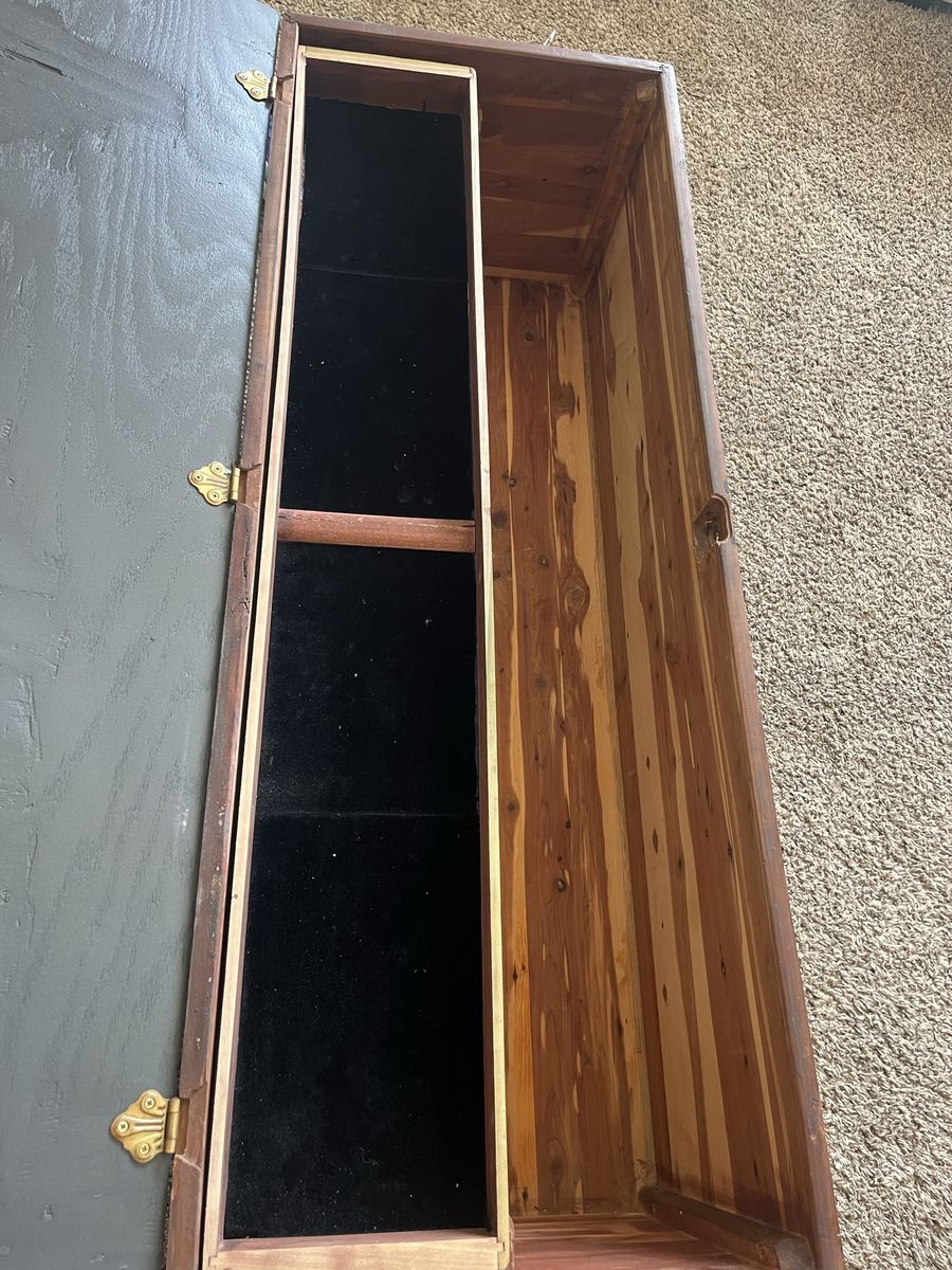 The interior has been cleaned and refreshed, maintaining the natural cedar lining—great for storing blankets, keepsakes, or seasonal items.