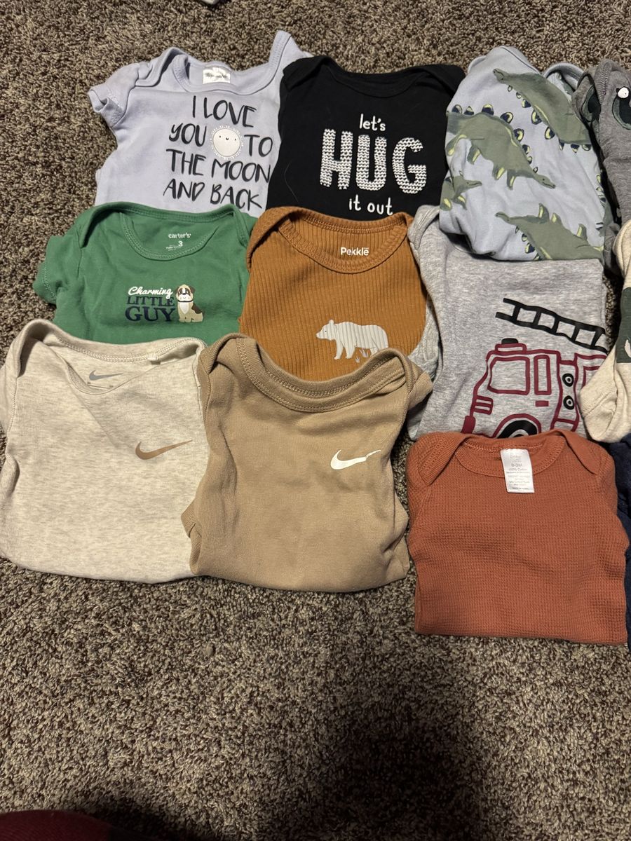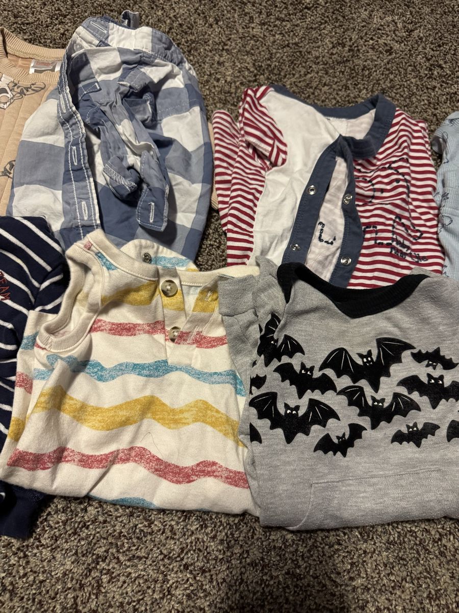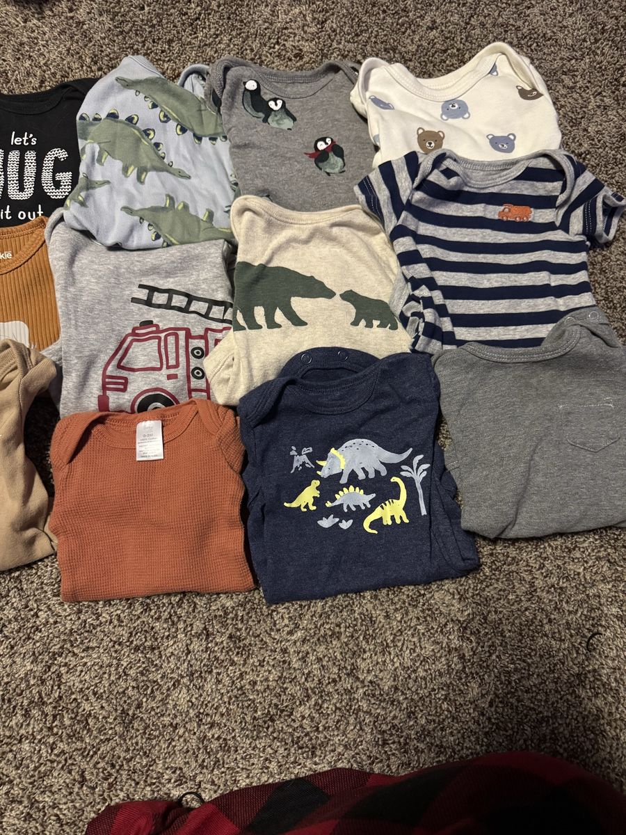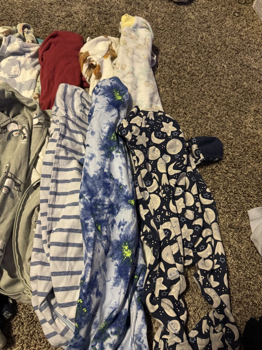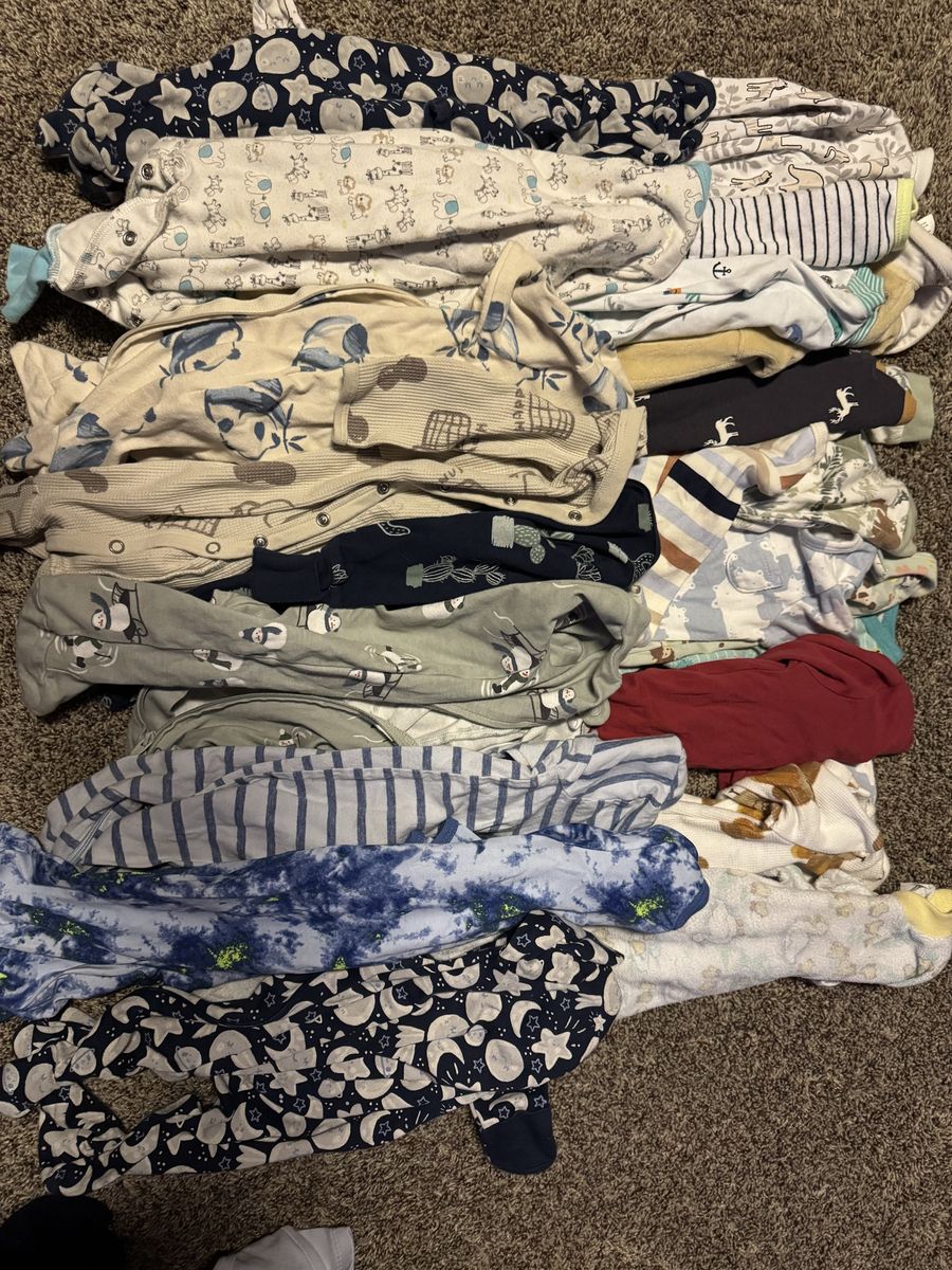 Selling all together there is a couple new born the rest are 0-3 and 3 months there is a few 6 months and3-6. Worn never or one time ( 25 pjs) (1complete set) (3 rompers) (15 onesies) (4jackets) (1 nice button up) (10 pants) (overalls with pants) CASH ONLY