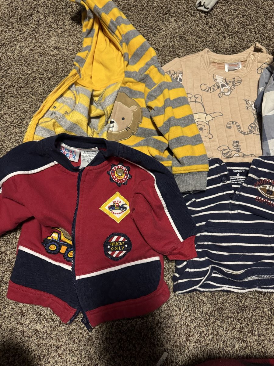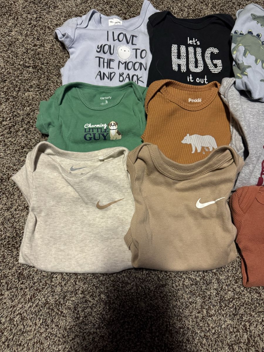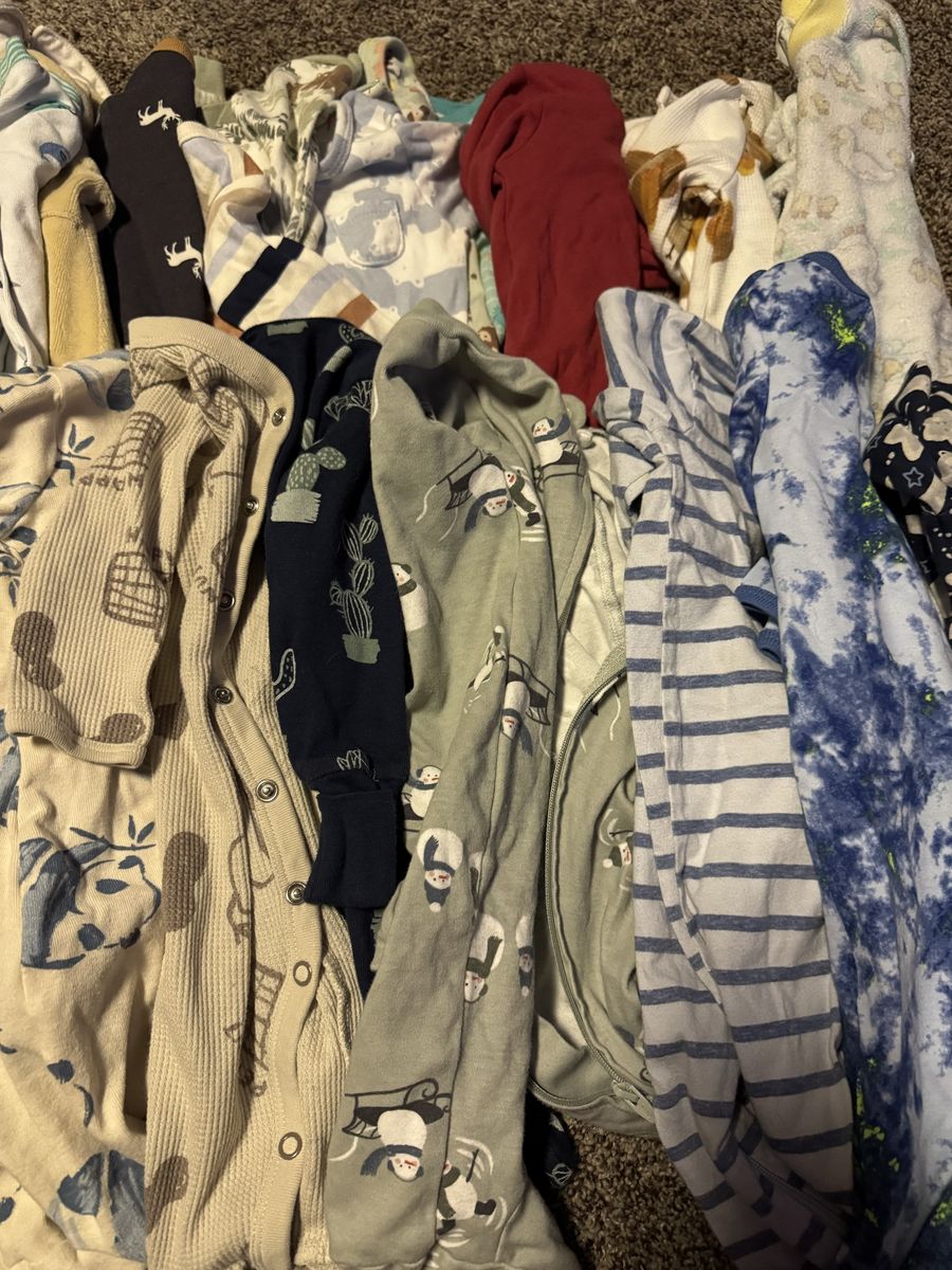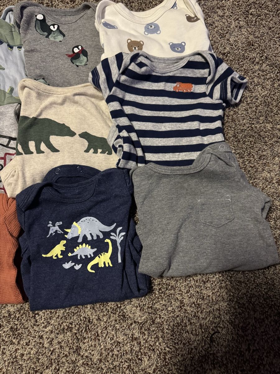 Selling all together there is a couple new born the rest are 0-3 and 3 months there is a few 6 months and3-6. Worn never or one time ( 25 pjs) (1complete set) (3 rompers) (15 onesies) (4jackets) (1 nice button up) (10 pants) (overalls with pants) CASH ONLY