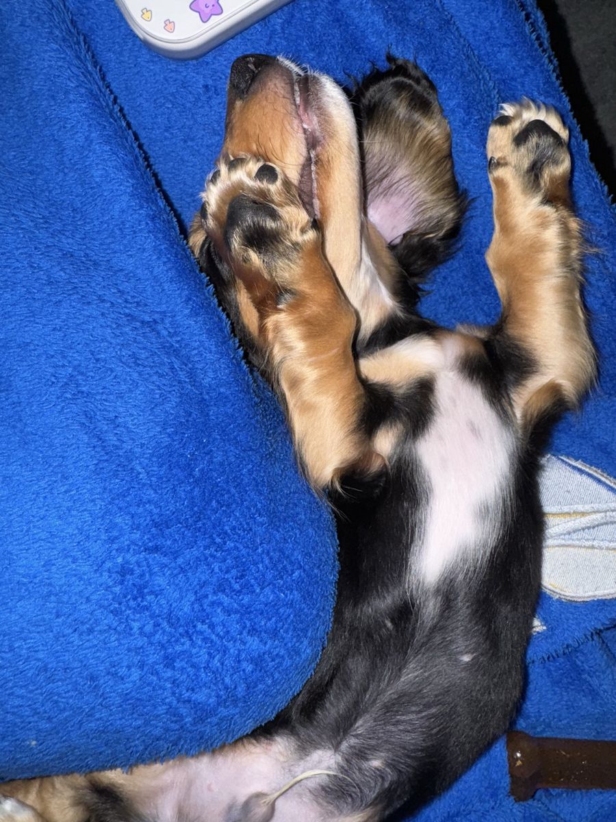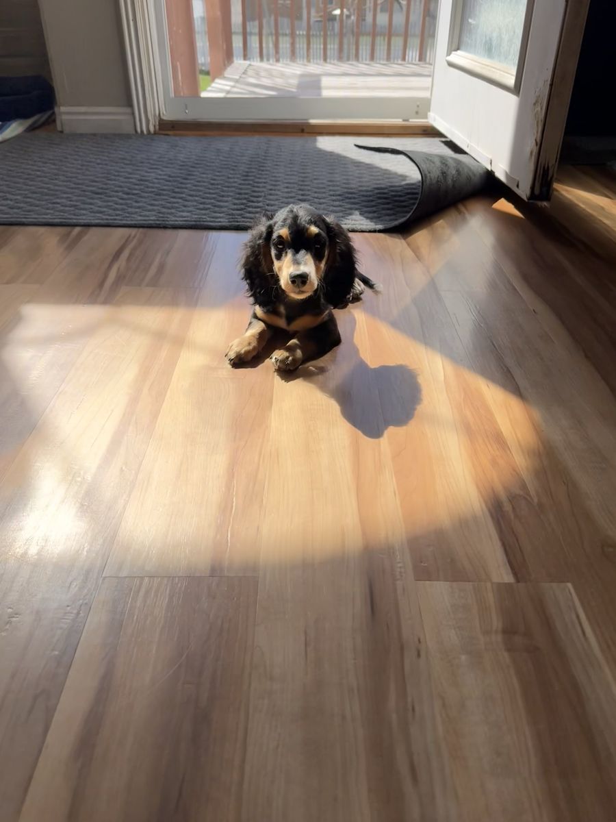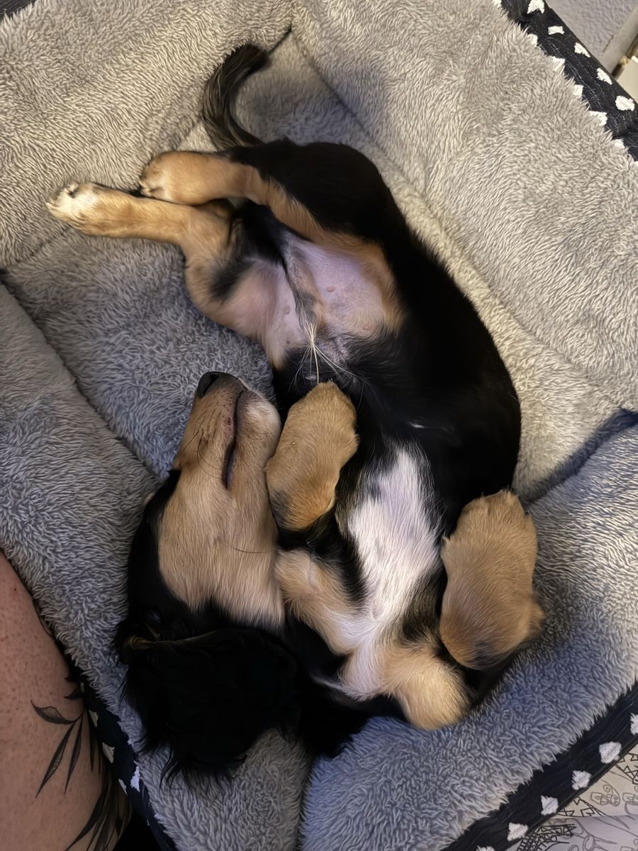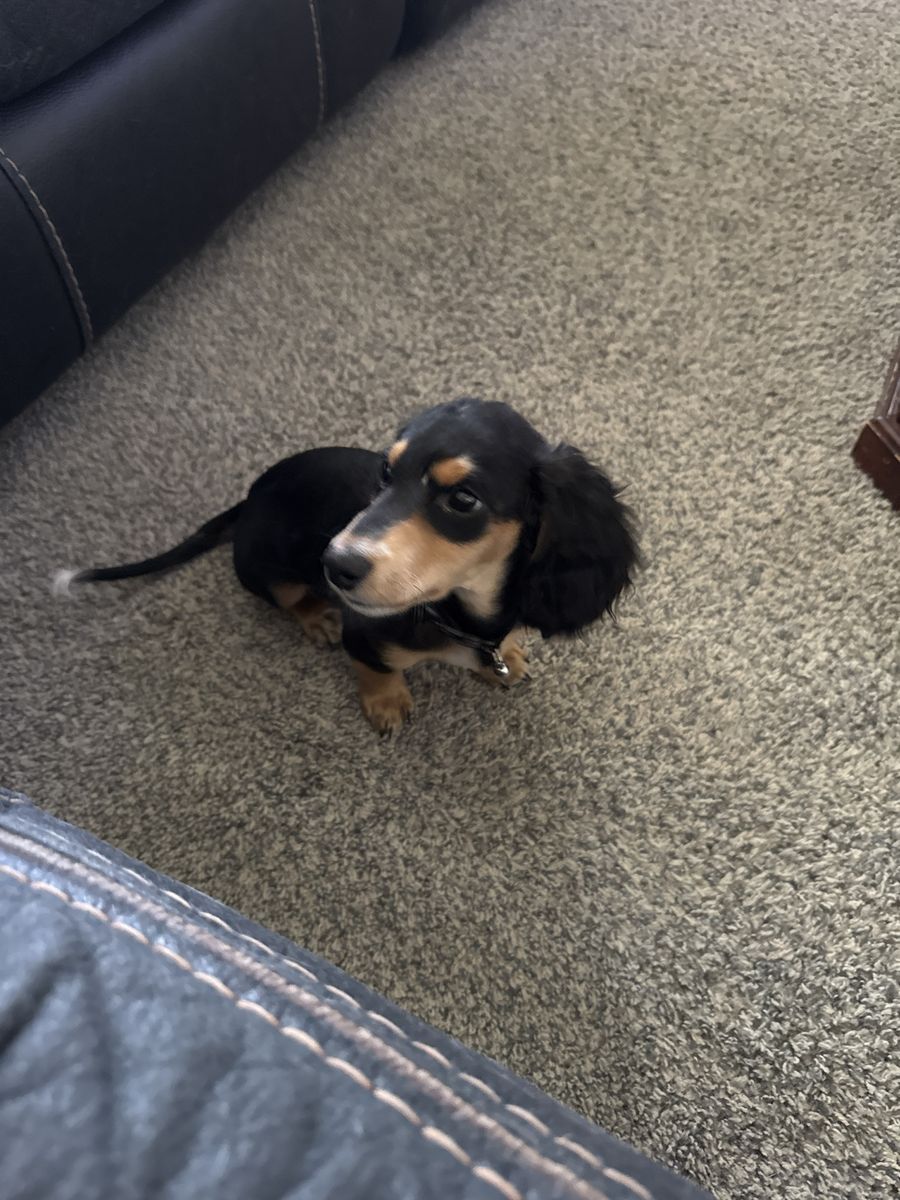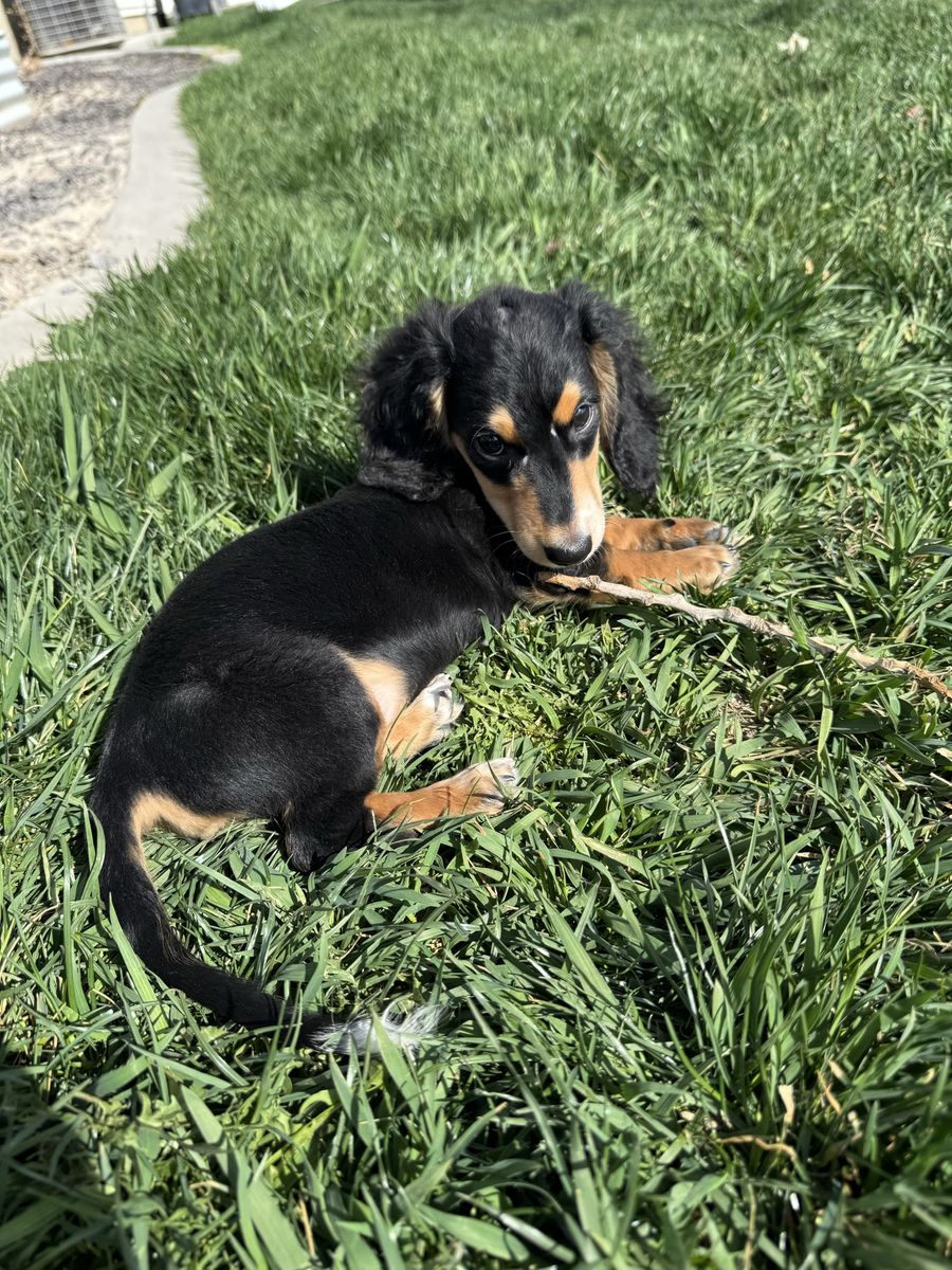 ZelleThis is Oscar! He’s a miniature long haired dachshund. He’s three months old and the most playful and friendly little dude! He’s been socialized with other small dogs and a few big dogs. He absolutely loves all people. Also he’s up to date on his shots.