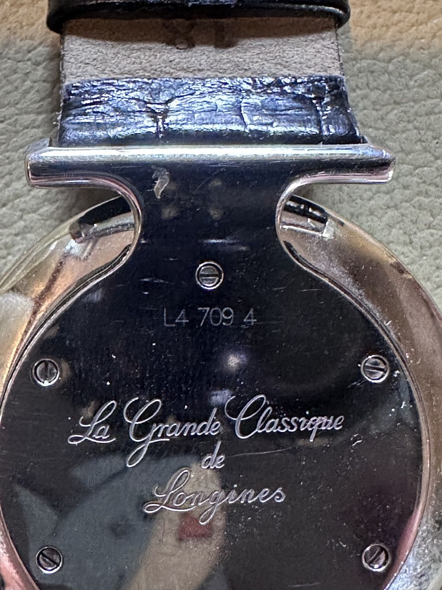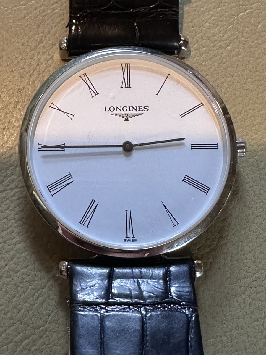 Brand: LONGINES Series: La Grande Classique Gender: Unisex Movement: Quartz Case Size: 33 mm Case Material: Stainless Steel Dial Color: White Dial Type/hands/markers: Analog / Black / Roman Numerals Crystal: Scratch Resistant Sapphire Bezel: Fixed (Silver - Stainless Steel) Band Material: Alligator Leather Band Type / Color: Strap / Black Functions: Hour, Minute Water Resistance: 30 m / 100 ft