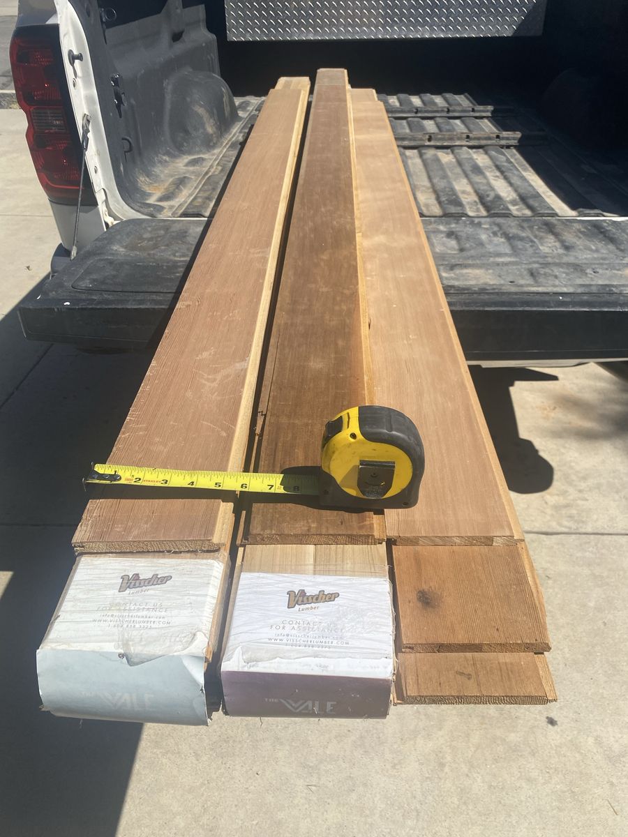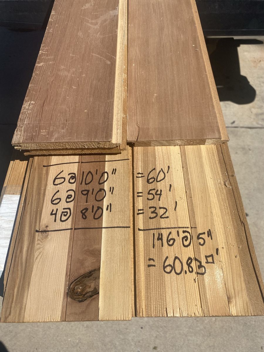 1/2 x 6 knot free cedar tongue and grove planks new but a few dings and dents from moving from job to inside garage. about 60 ft.².