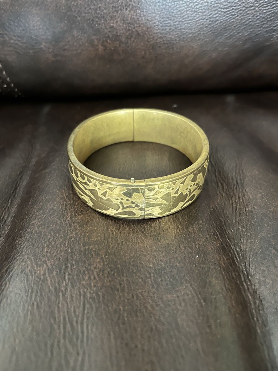 VenmoDecorative and fun brass bangle. This is hinged for easy on and off. This has a nice pattern on it. Price is firm.