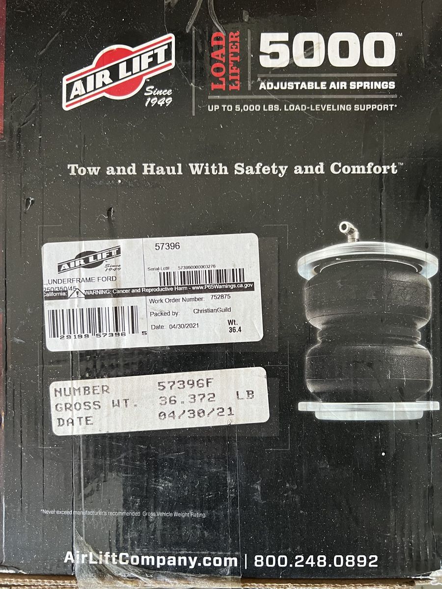 VenmoAirlift LoadLifter 5000 PT# 57396 Fits Ford F-250 to F-450 2011-2016 under frame kit. New in box. I bought this for a truck and never installed it. This will work with both Ford and aftermarket 5th wheel hitch kits.