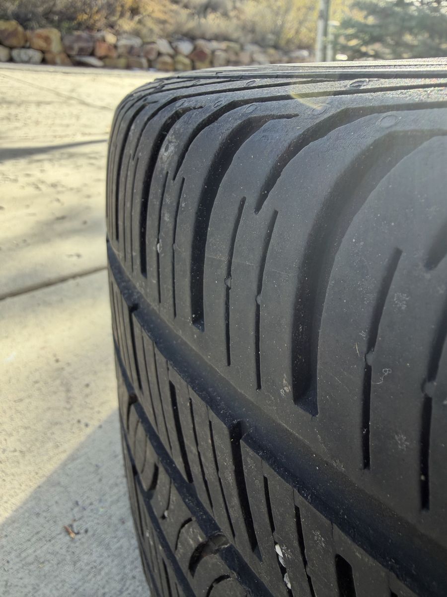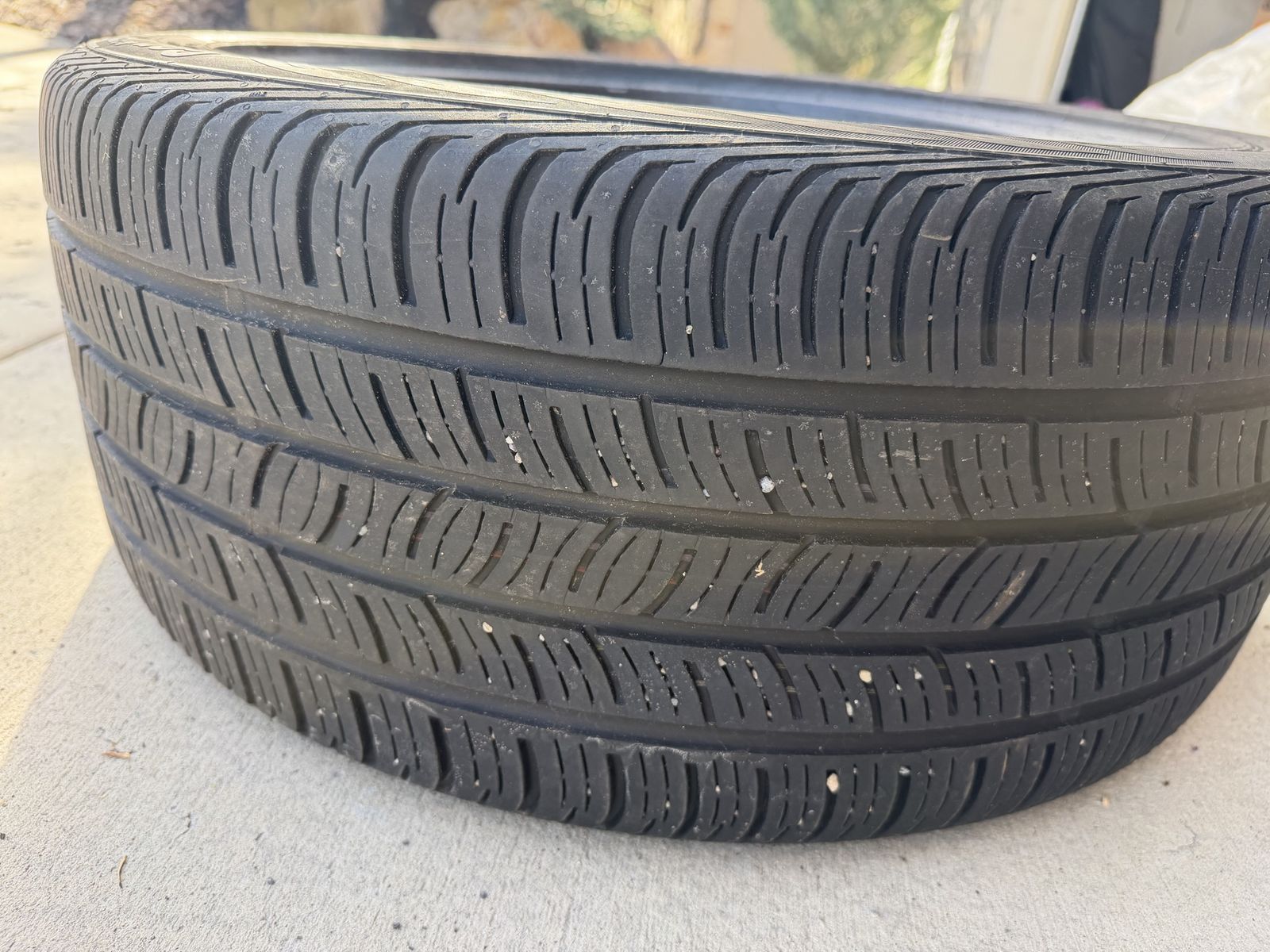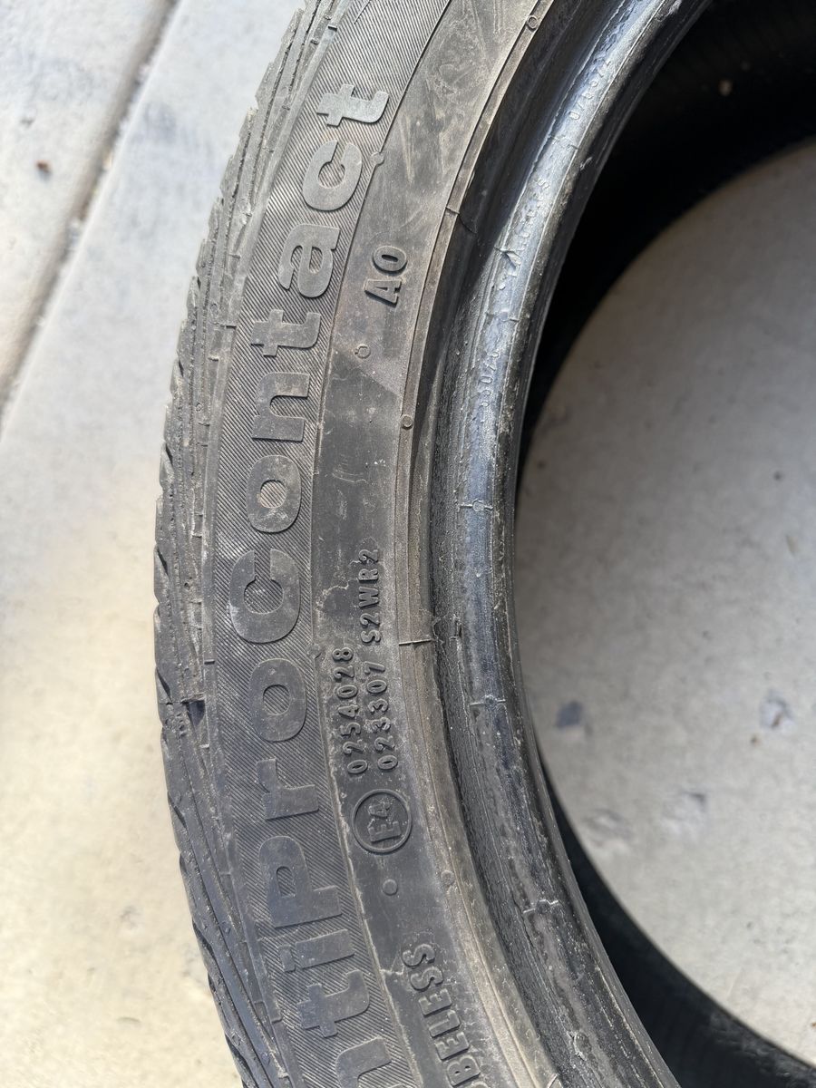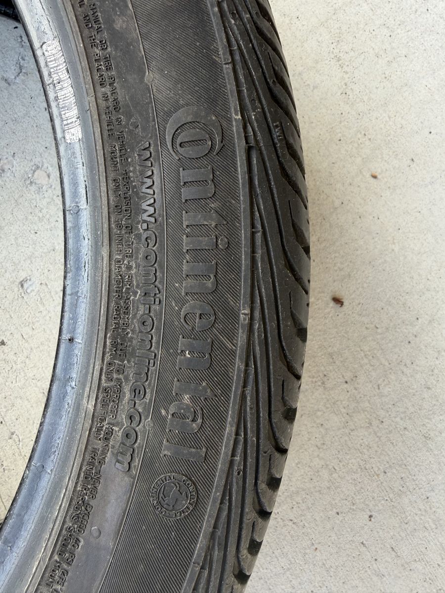 Durable Continental ProContact radial tire has plenty of tread left. This black tubeless tire is an AO (Audi Original) equipment model. It shows even wear across the surface and is ready for a replacement or spare. Have all 4.