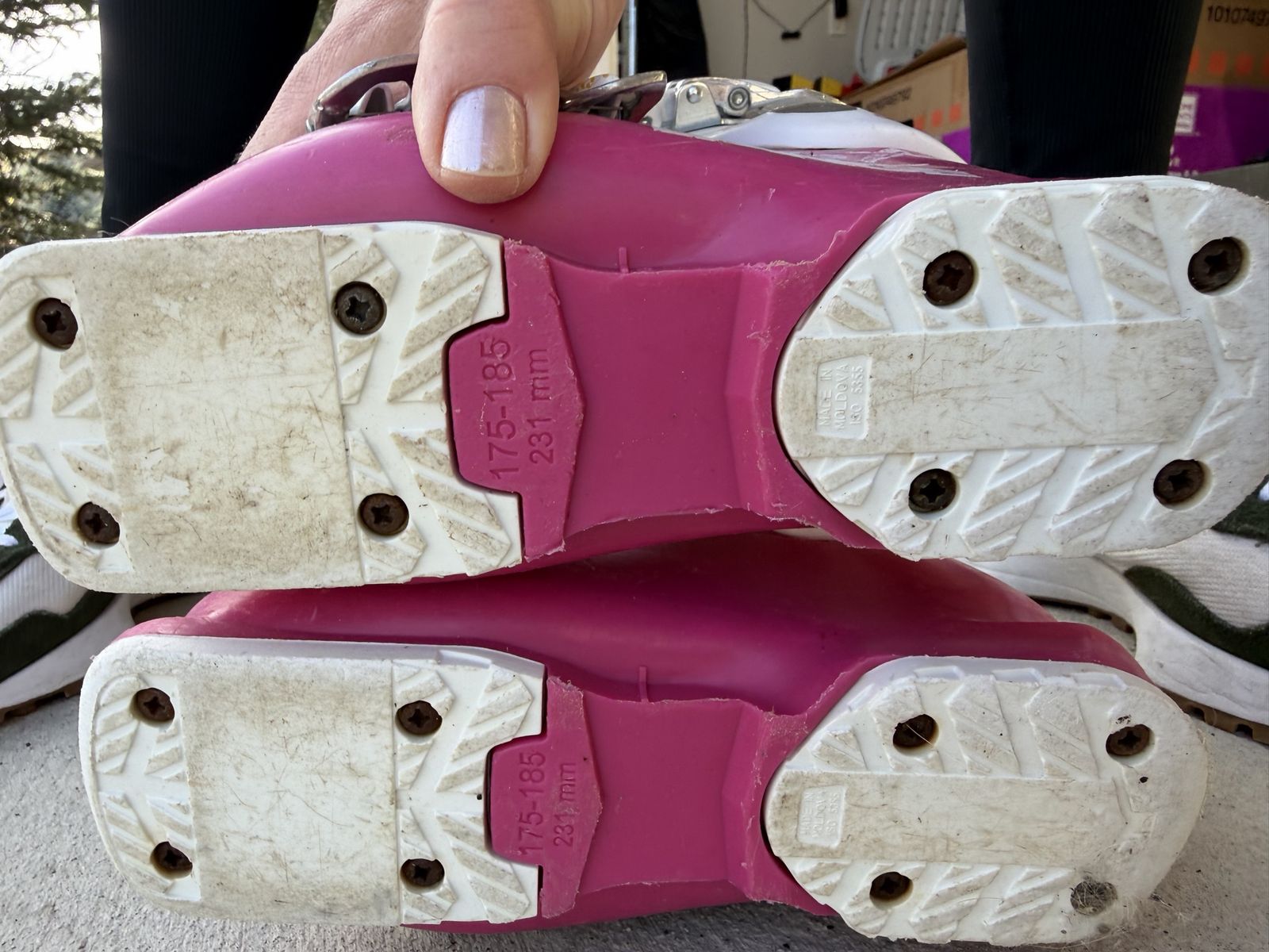 PayPalPink and white K2 downhill ski boots. These have a three-buckle design for a secure fit. Sole length is 231 mm with a size range of 175-185 marked on the bottom. Interior has black padded liners and white pull loops. Purchased new. Worn one season - 15 days.