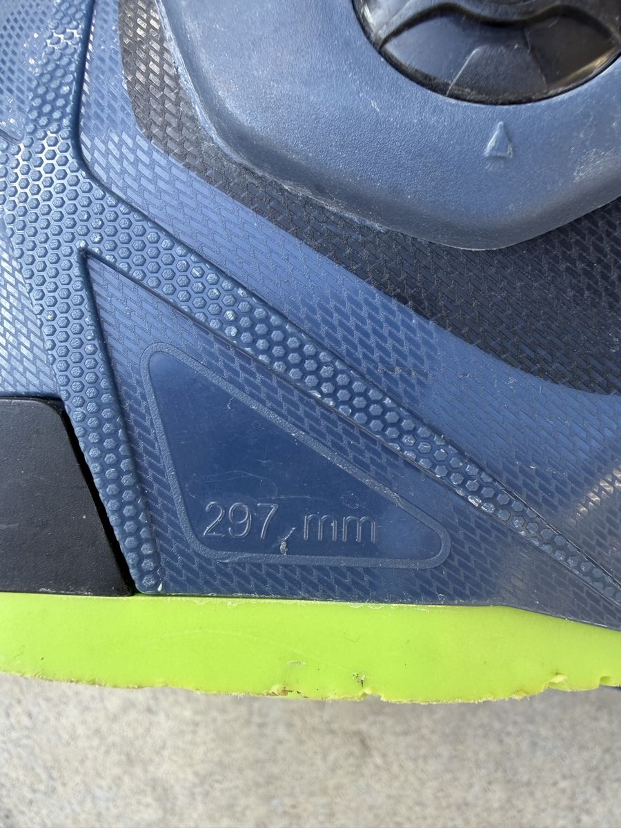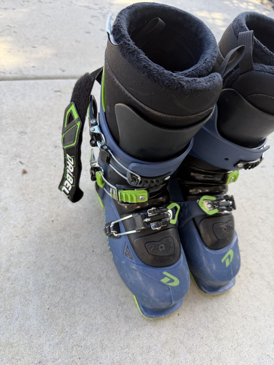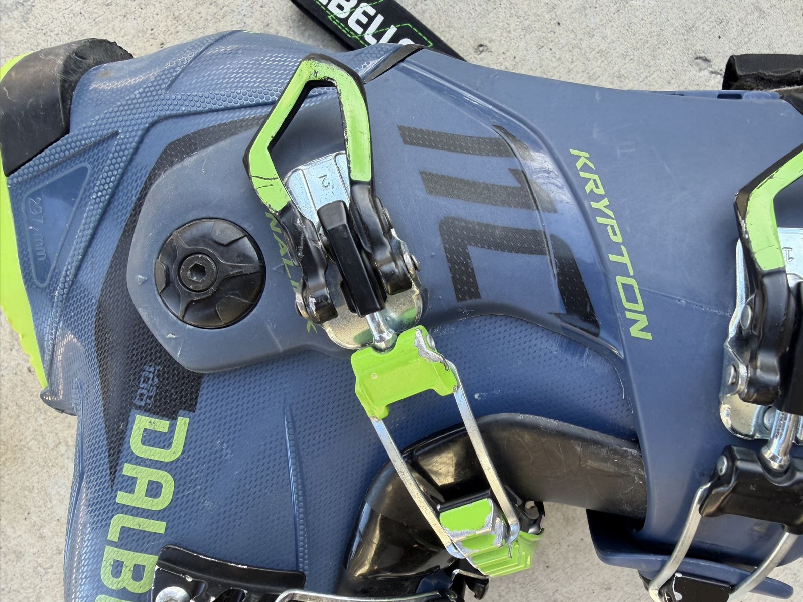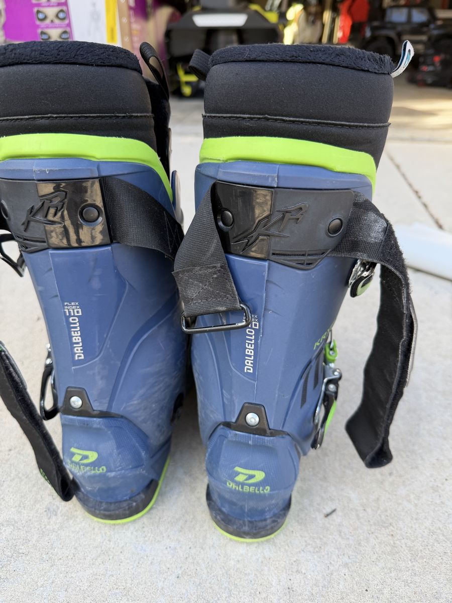 ApplePayDurable Dalbello Krypton 110 ski boots in blue and black with lime green accents. These have a 110 flex index and a 297mm sole length. Three-buckle design with a wide power strap for a secure fit. Liners are intact and show standard wear. Size 25.5. Purchased in 2019 from Alta ski shop- worn ~180 days