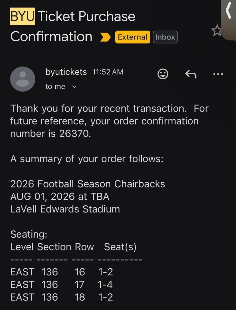 Venmo1-3 BYU home season tickets. Some buddies moved so I have 3 extra. Had to be platinum this year to get these seats. They are section 136 on the inside aisle. Row 18 Seat 1-2 At the 20 yard line. Fantastic view of everything. 7 home games this year including a beat down of Notre Dame. I have paid for the padded stadium seats as well for the whole season for them.