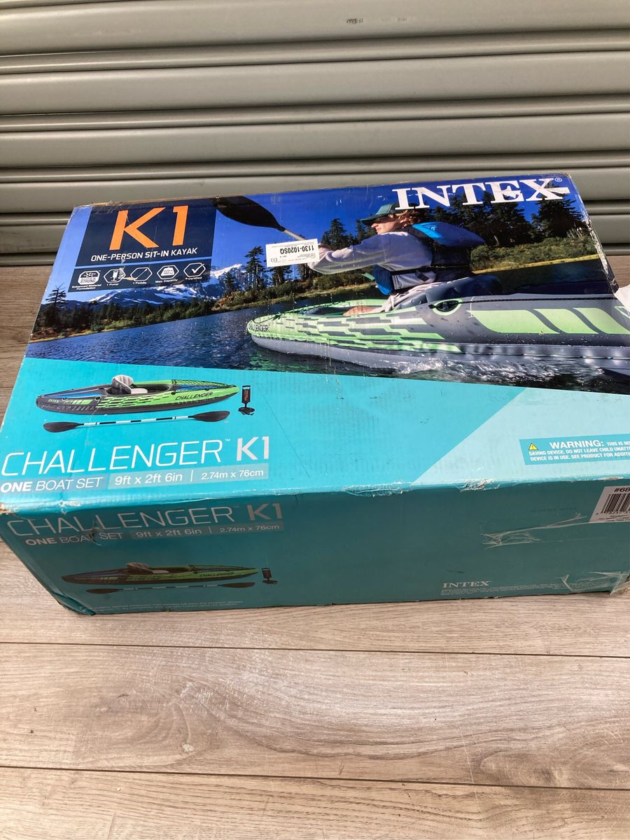 The Intex Challenger K1 1-person inflatable kayak has a 220-pound capacity making it great for boating and fishing on lakes or mild rivers; The kayak only weighs 27 pounds and is U.S. Coast Guard I.D and TUV approved Comfortable and spacious cockpit with inflatable seats, backrests, and a cargo net to keep personal belongings in the boat; Streamline design for easy paddling and removable skeg for directional stability Inflatable I beam floor for comfort and rigidity, streamlined design for easy paddling, grab lines on both ends and made of rugged tough 30 gauge vinyl for durability Strong molecular structure of this plastic makes it highly resistant to damage from abrasion, impact, and sunlight with special PVC plastic material also allows more air pressure for greater rigidity while maintaining the PVC material's natural flexibility The easy-to-store and carry package includes the Challenger K1 kayak, 86-inch aluminum oar, High capacity/output hand pump with 2 quick fill, fast deflate Boston valves on main hull chamber, repair patch kit, and carry bag Dimensions (L x W x H): 108 x 30 x 13 inches Grab lines on both ends Noticeable graphics give a sporty flair and maximize safety on the water TUV RL Approved Weight Capacity: 220 pounds Weight: 27 pounds