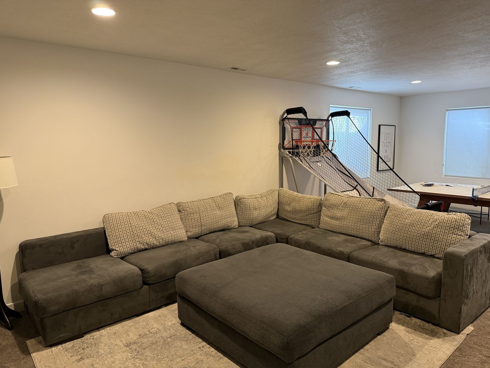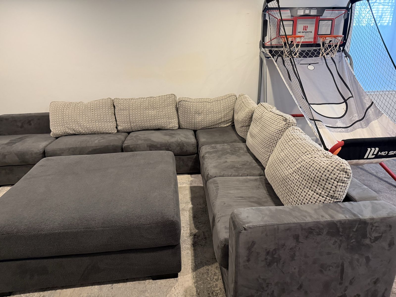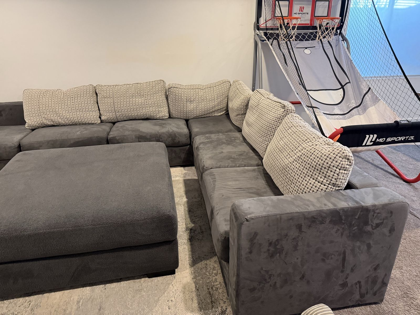 Beautiful Lovesac Sactional in great shape. Large modular sectional with matching oversized ottoman, shown with accent pillows. Charcoal/gray velvet-style upholstery with a clean, modern look. The modular design lets you reconfigure the pieces to fit your room. Buyer to pick up.