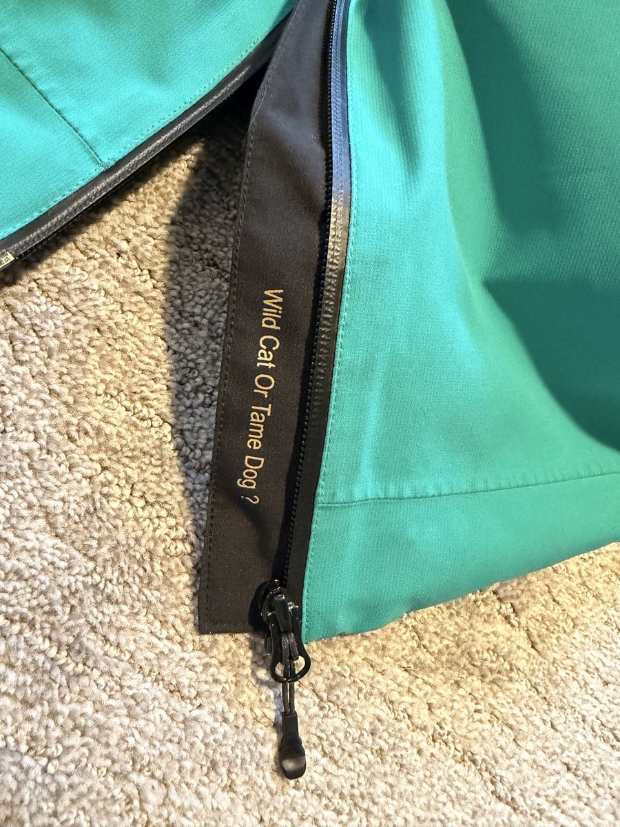 Extras: • Clean black/teal colorway • Unique detail inside zipper (“Wild Cat or Tame Dog?”) • Lightweight but warm — great all-mountain jacket