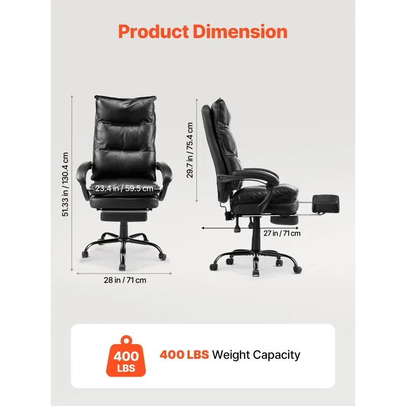 Executive Office Chair with Footrest, 400lb Capacity Office Chair with Lumbar Pillow, Heavy Duty Ergonomic Chair, Height Adjustable PU Leather Reclining Home Office Desk Chairs Zoned Support Comfortable Recline Sturdy & Pressure-Resistant Premium Comfort Experience Easy Height Adjustment Ergonomic Design Caster Material: Nylon (Plastic),Seat Width: 23.43 in / 595 mm,Main Materials: Steel + Foam + PU Leather + PVC + Wood,Weight Capacity: 400 lbs181.44 kg /,Footrest: Large Integrated Footrest,Item Model Number: HC-2507-2,Product Weight: 44.34 lbs / 20.10 kg,Gas Lift Class: Class 3,Features: Backrest Tilts up to 135°, Lumbar Cushion, Height-adjustable,Product Dimensions: 28.00 x 27.00 x 51.33 in / 710 x 685 x 1304 mm,Backrest Height: 29.7 in / 754 mm,Lift Range: 0-3.94 in / 0-100 mm Product Type: Executive Chair Seat Material: Foam Back Material: Foam Arms Included: Yes Swivel: Yes Lumbar Support: Yes Casters / Wheels: Yes Weight Capacity: 400 Seat Color: Black Frame Color / Finish: Polished Plug-In: No