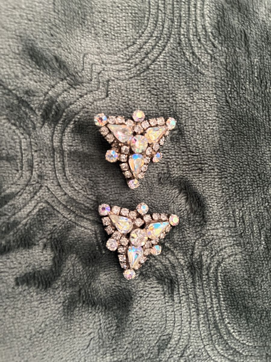 VenmoThese are from the 1950's and they are stunning! These are in excellent condition and they sparkle. There are so many vibrant colors in the four different stones. These have a retro glam look to them. The shape is a triangle that measures 1 1/2 inches across. They are set in a prong setting giving them a secure and elegant look. They are marked 'La Roca' on the back of the earrings. These are a timeless treasure to be enjoyed for many, many years. Price is firm.