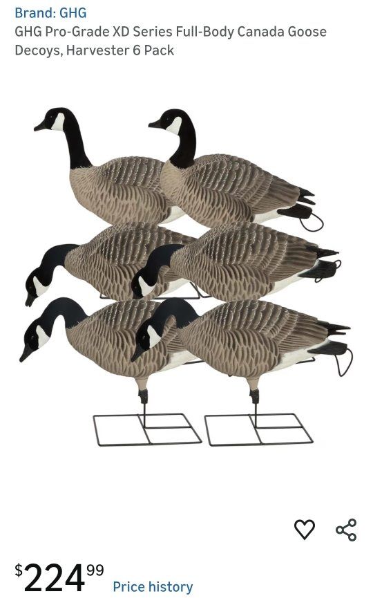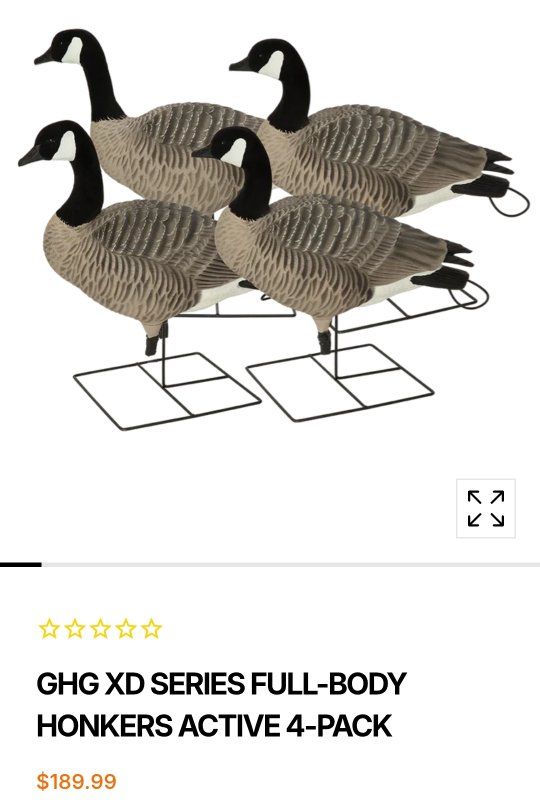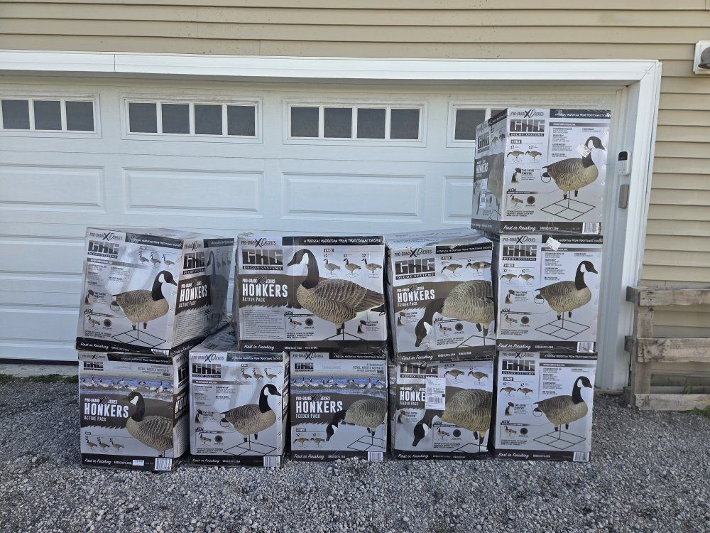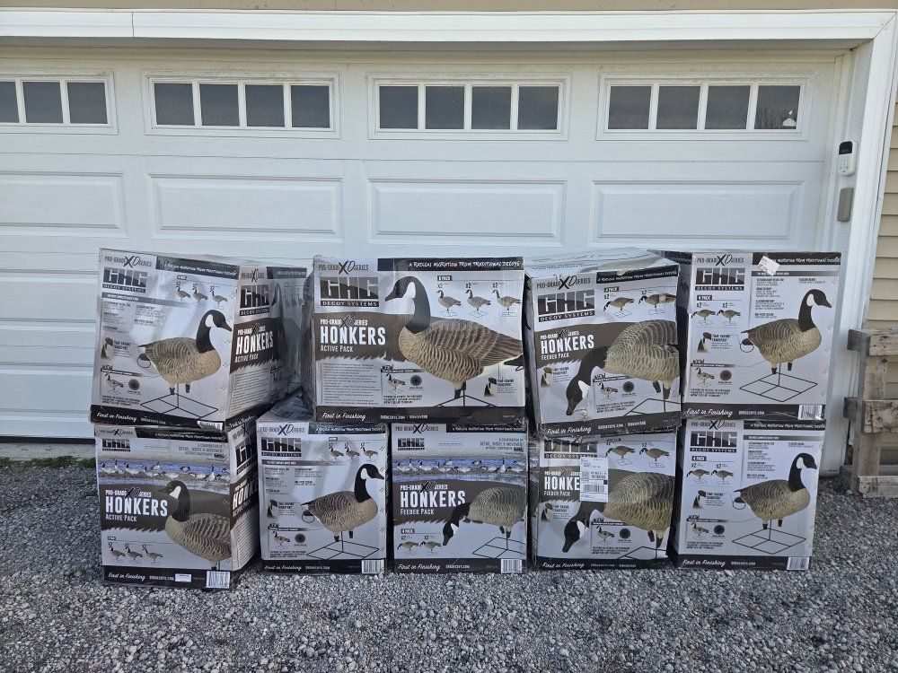 4 x GHG Pro Grade XD Series 6 pack 6 x GHG Pro Grade XD Series 4 pack 6 x FA HD Full Body Honkers 4 pack 2 x Rogers Goosebuster XL 2.0 w/ snow covers and shotgun holder Rogers Toughman Decoy Slot bags