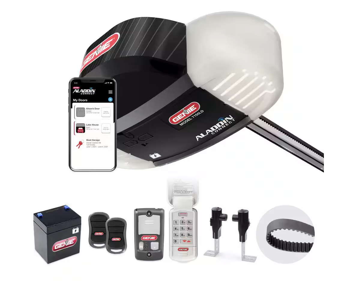 1-1/4 HPc DC motor provides power to operate residential sectional garage doors up to 7ft in height and 500 lbs. in weight Smart garage door opener: Aladdin Connect smart home technology built-in Aladdin Connect requires Wi-Fi connection to work remotely. Unit will function without Wi-Fi connection by means of Genie Intellicode Remotes, Consoles and Keypads. Integrated battery backup: garage door opener with battery backup can power the garage door opener Homelink + car2U integration comes standard, no additional hardware required Includes 2 pre-programmed 3-button garage door opener remotes, a wireless keyless keypad and a multi-function wall console (control panel) with an independent light control and vacation lock