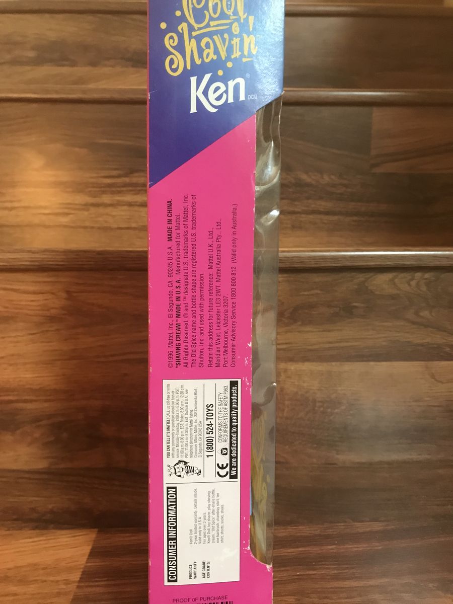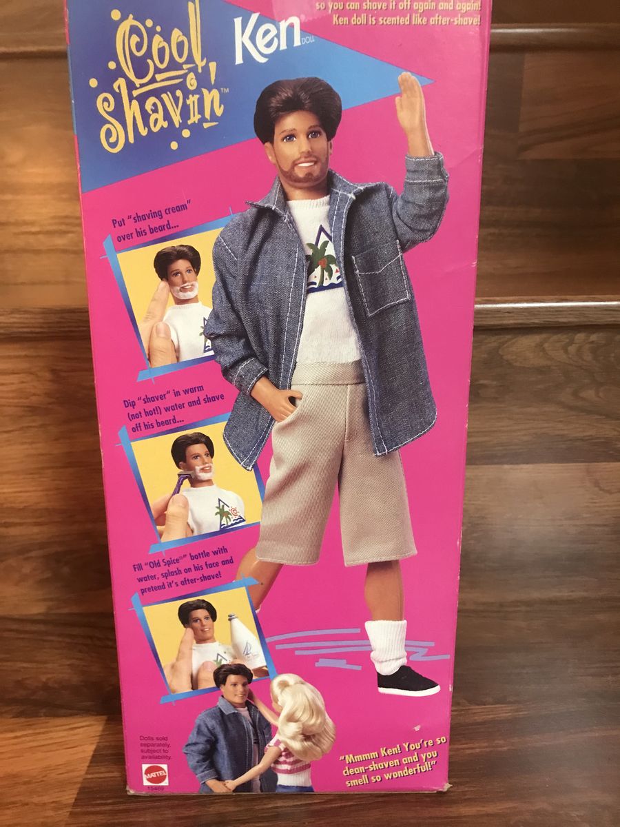 Cool Shavin Ken Barbie is an interactive doll with color changing beard that will grow back shave after shave. Doll is in excellent brand new condition, has never been taken out of the box. It comes with shaving cream, razor, hair brush, and Old Spice bottle. The accessories except shaving cream are loose in the box as the bands gave away. Box shows light wear due to age and storage