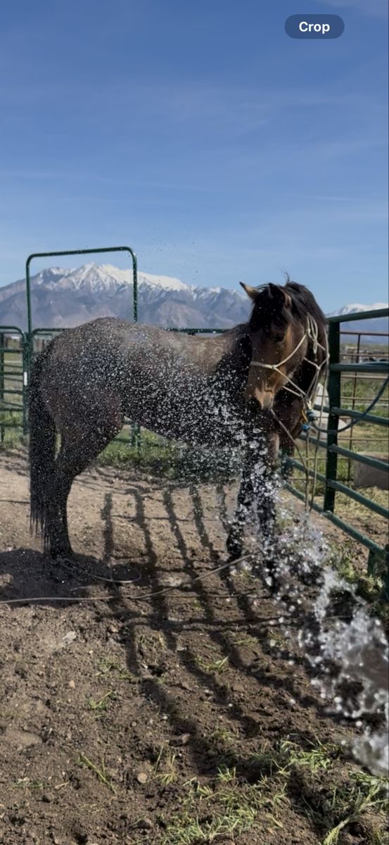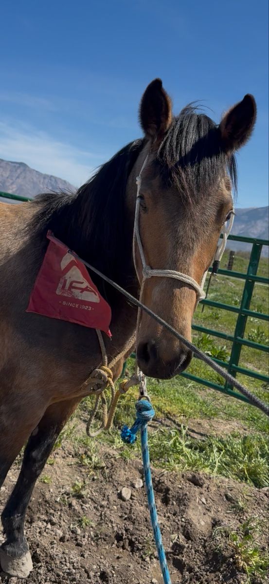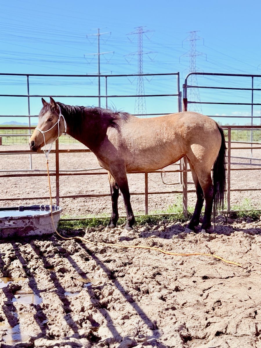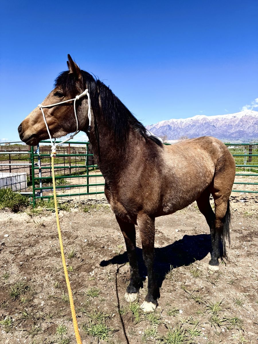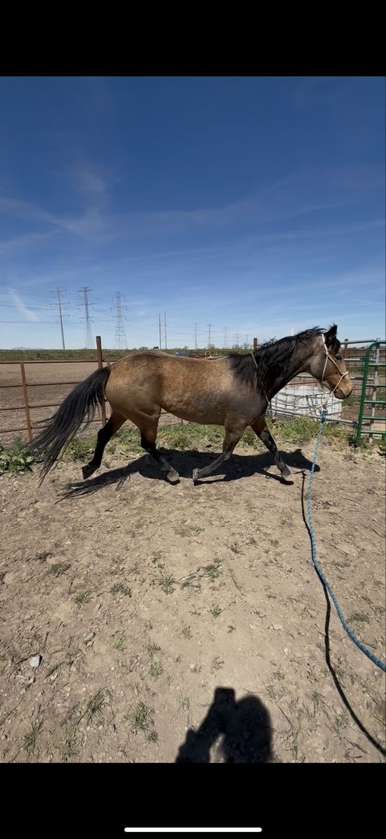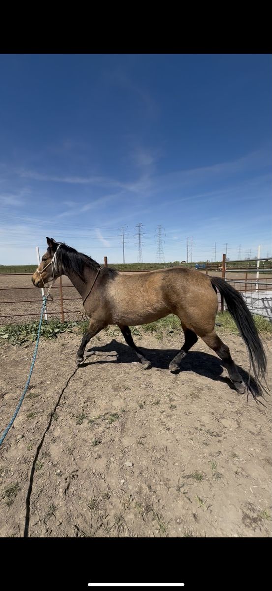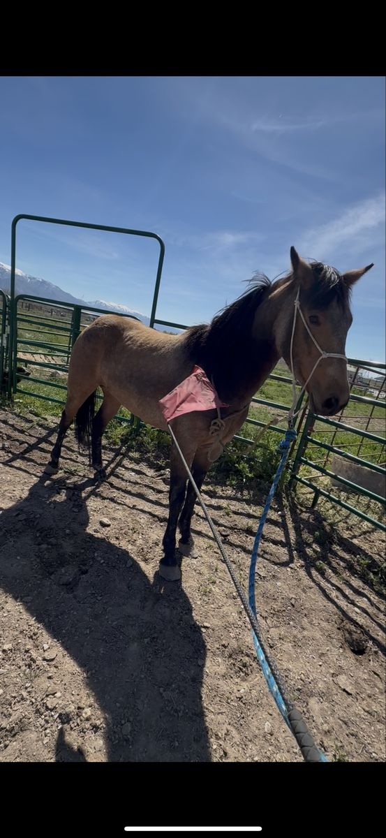 Coming 3yr old buckskin filly, standing about 15-15.1hh Sells grade, but came from a ranch in ID, ranch stock type. Halter broke, stands tied, lunges both ways, loads in a trailer and has been desensitized to a rope. She needs someone that has time to fully dedicate to her. She has a kind nature and wants to be good but needs help to get there. She’s been dewormed. Unfortunately she’s not going to work for what I need.