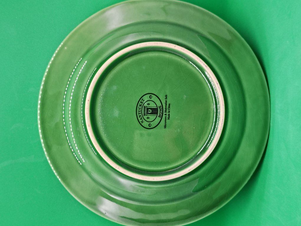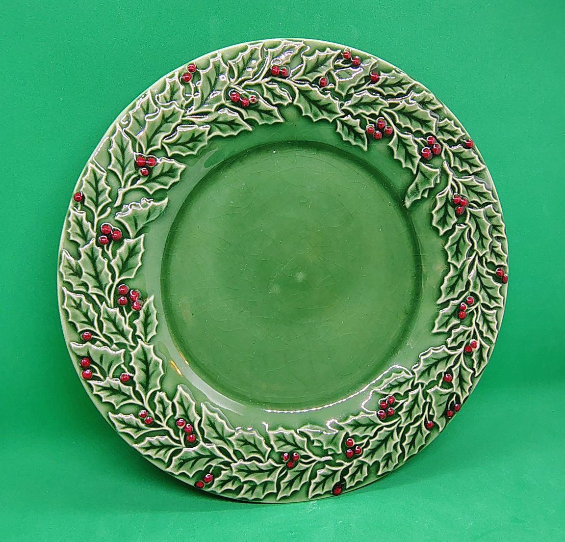 This plate is part of the NHM3 pattern produced by Nantucket Home. It is a discontinued green stoneware pattern featuring an embossed design of holly leaves and red berries with no trim. Product Details Material: Glazed stoneware or earthenware. Design: Deep green hue with 3D embossed holly leaves and small red berries. Status: This patterns, NHM3, is currently discontinued. Size: Approximately 8 1/8 inches diameter.