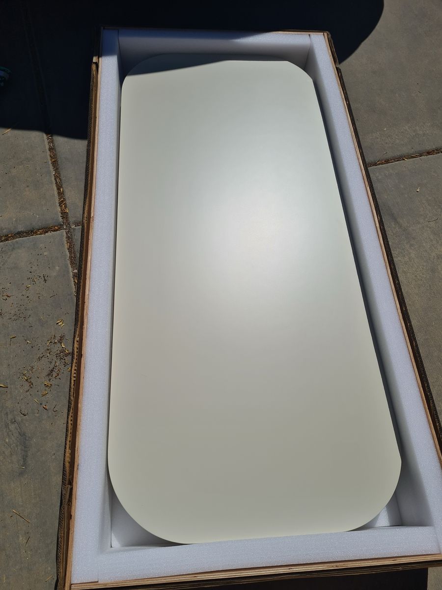 This is the DESKTOP ONLY; legs are not included. Bottom of desk shown to show possible attachment locations. Multiple pictures shown with desk leg options. Reversible base cabinet attachment points allow left or right configuration to suit various room layouts.