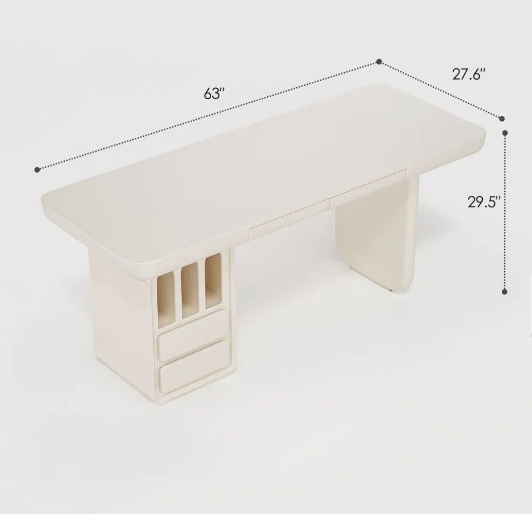Desktop Dimensions: 63” L x 27.6” W Two drawers at the front of the desk. Rounded corners / edges for a sleek modern look. Piano lacquer finish, enhances the desk's quality and makes it easy to clean and maintain. Heavy, built with durable and sturdy materials.