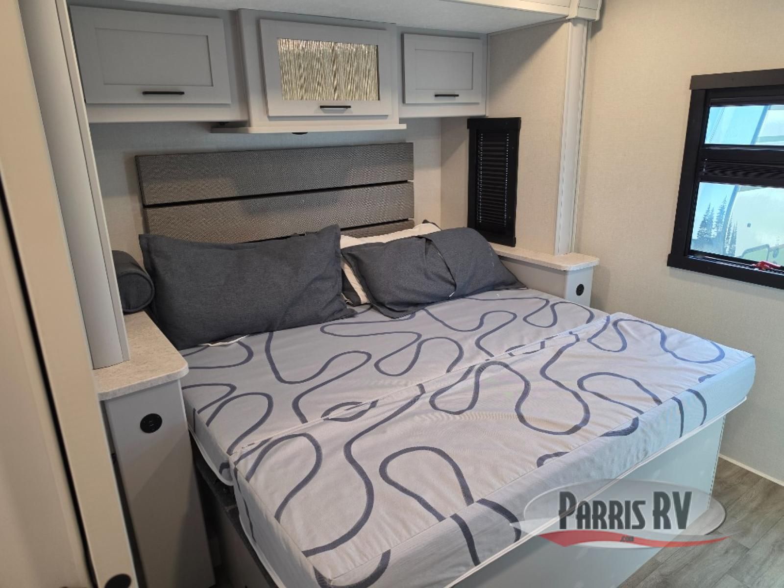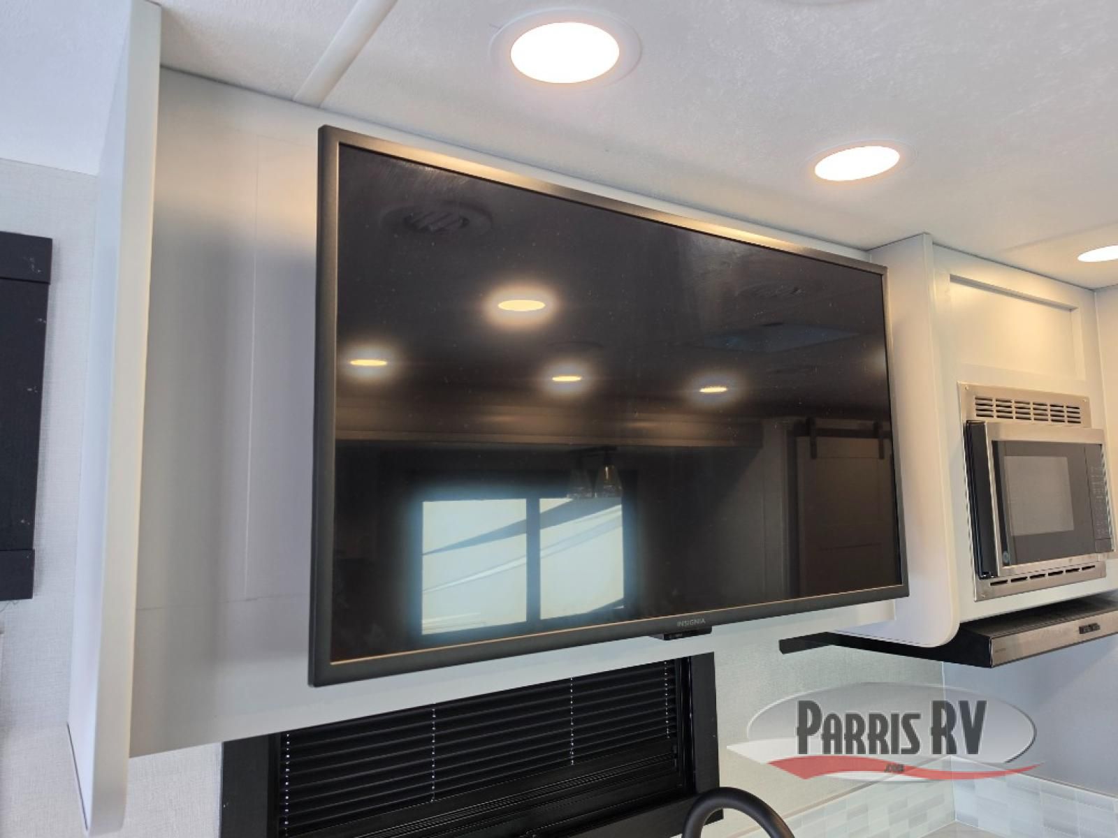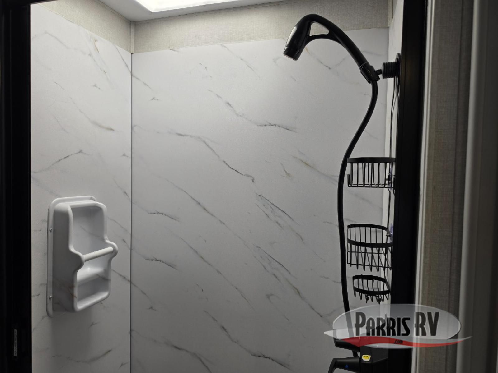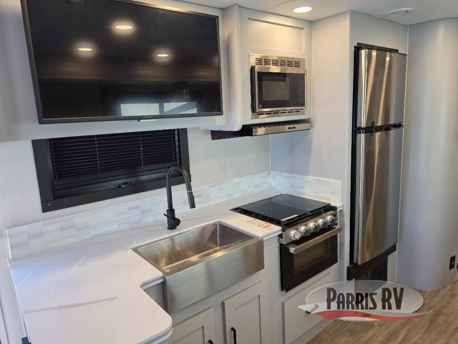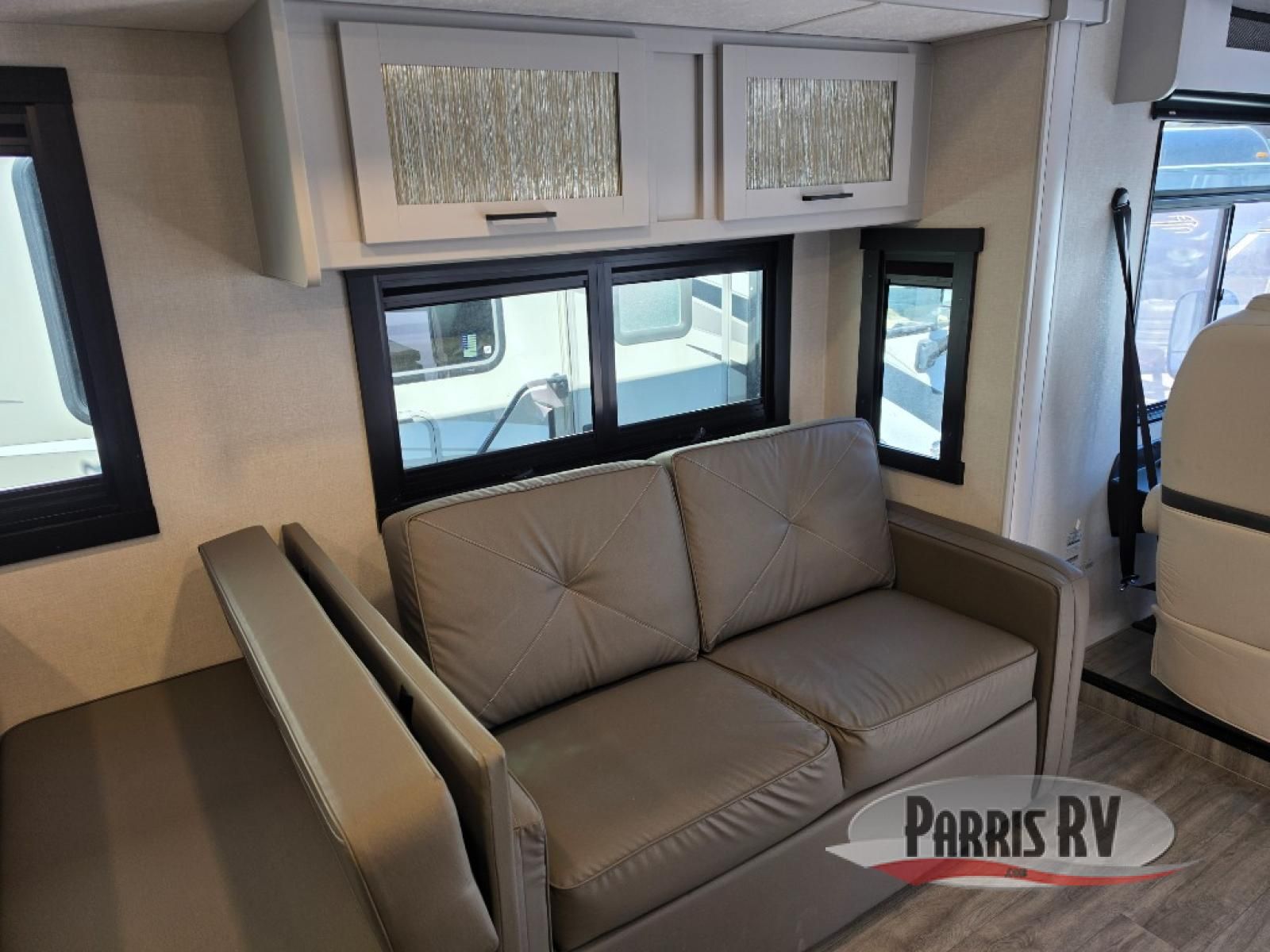 The whole gang will love this motorhome thanks to its drop-down overhead bunk, rear private bedroom, and 71" bunk/office/wardrobe space for versatility! Once breakfast has been prepared on the stainless steel three burner range, everyone can dine at the booth dinette or sit on the 63" sofa within the large slide out. There is a 40" LED TV across from the sofa for convenience, and you'll find two additional TVs; one in the bedroom and one outside! This model includes a full bath with a shower skylight, a retractable shower door, and a power bath vent to keep everything fresh. After you've gotten ready for the day, head outdoors to relax under the 17' power awning and watch the big game on the exterior TV!