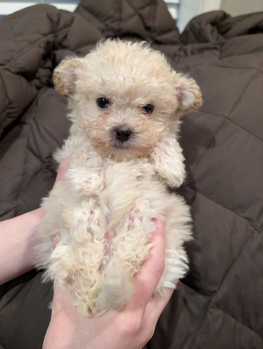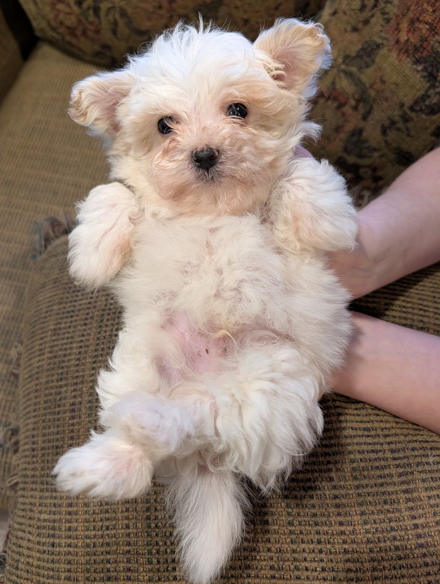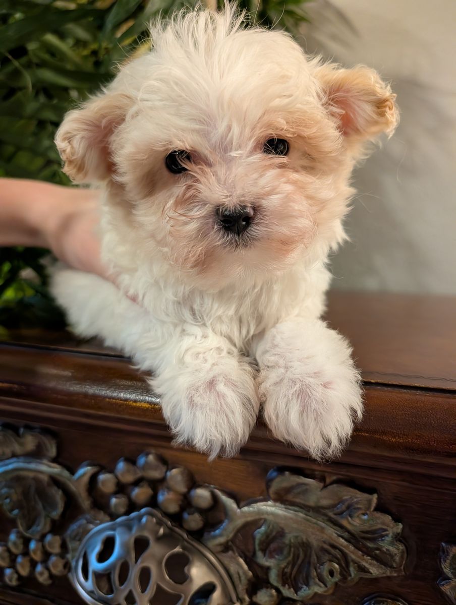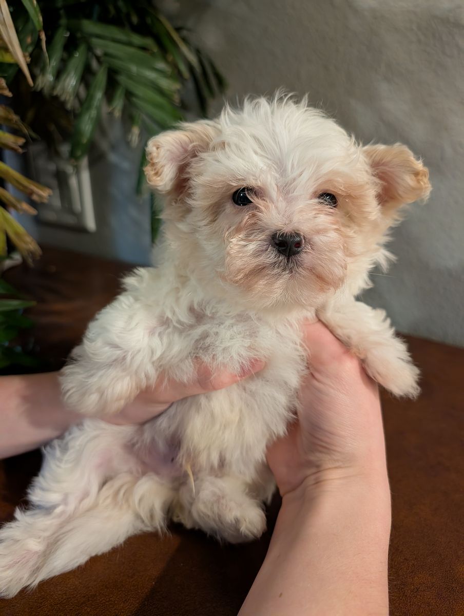 These adorable maltipoo puppies were born on Valentine's Day. The mother weighs 11 pounds, and the father weighs around 12 pounds. They are now over eight weeks old and ready for their forever homes. Each puppy has received its first set of vaccinations and has had a healthy vet check. We only have males left: a beige male and a white male. They both have very loving personalities. I own both parents.