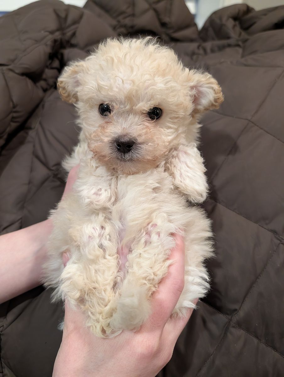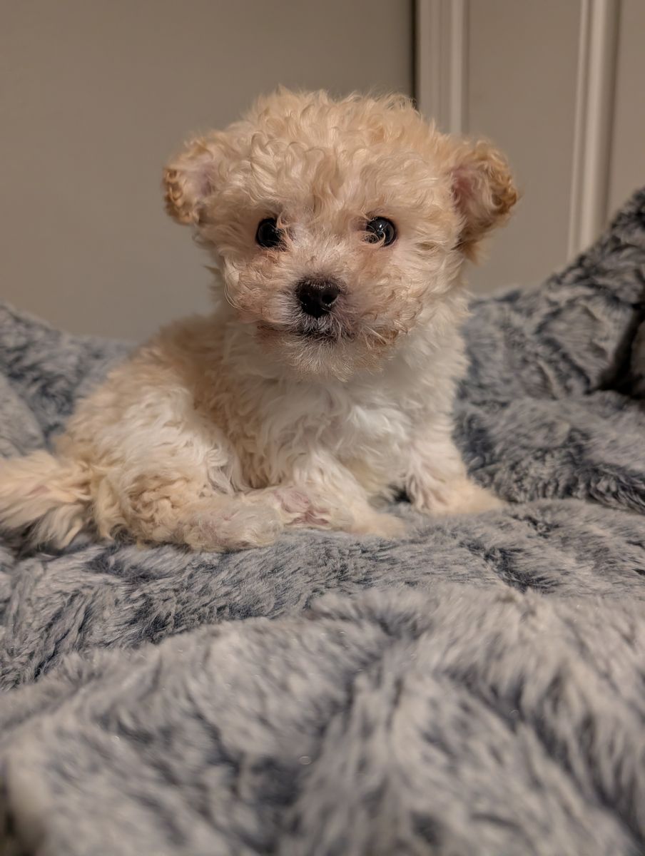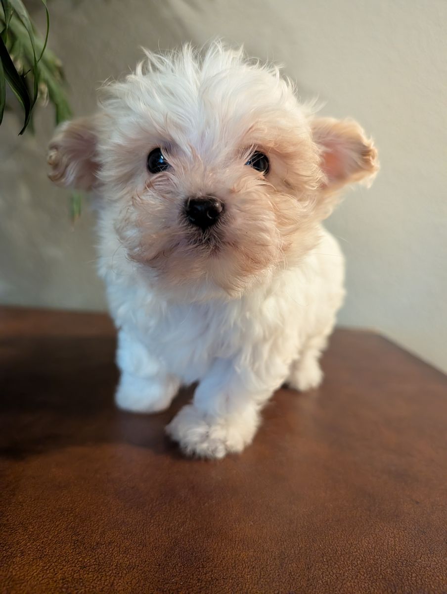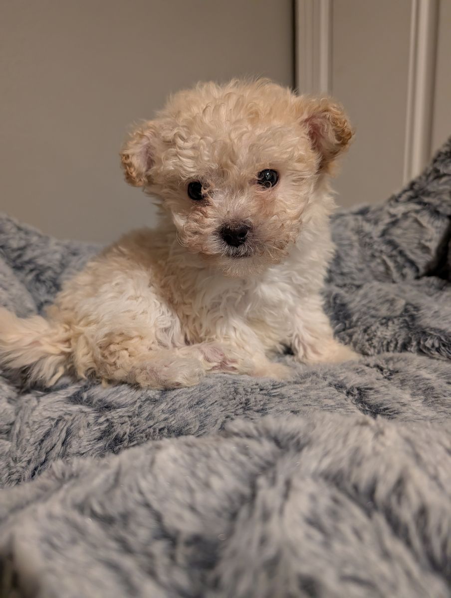 These adorable maltipoo puppies were born on Valentine's Day. The mother weighs 11 pounds, and the father weighs around 12 pounds. They are now over eight weeks old and ready for their forever homes. Each puppy has received its first set of vaccinations and has had a healthy vet check. We only have males left: a beige male and a white male. They both have very loving personalities. I own both parents.