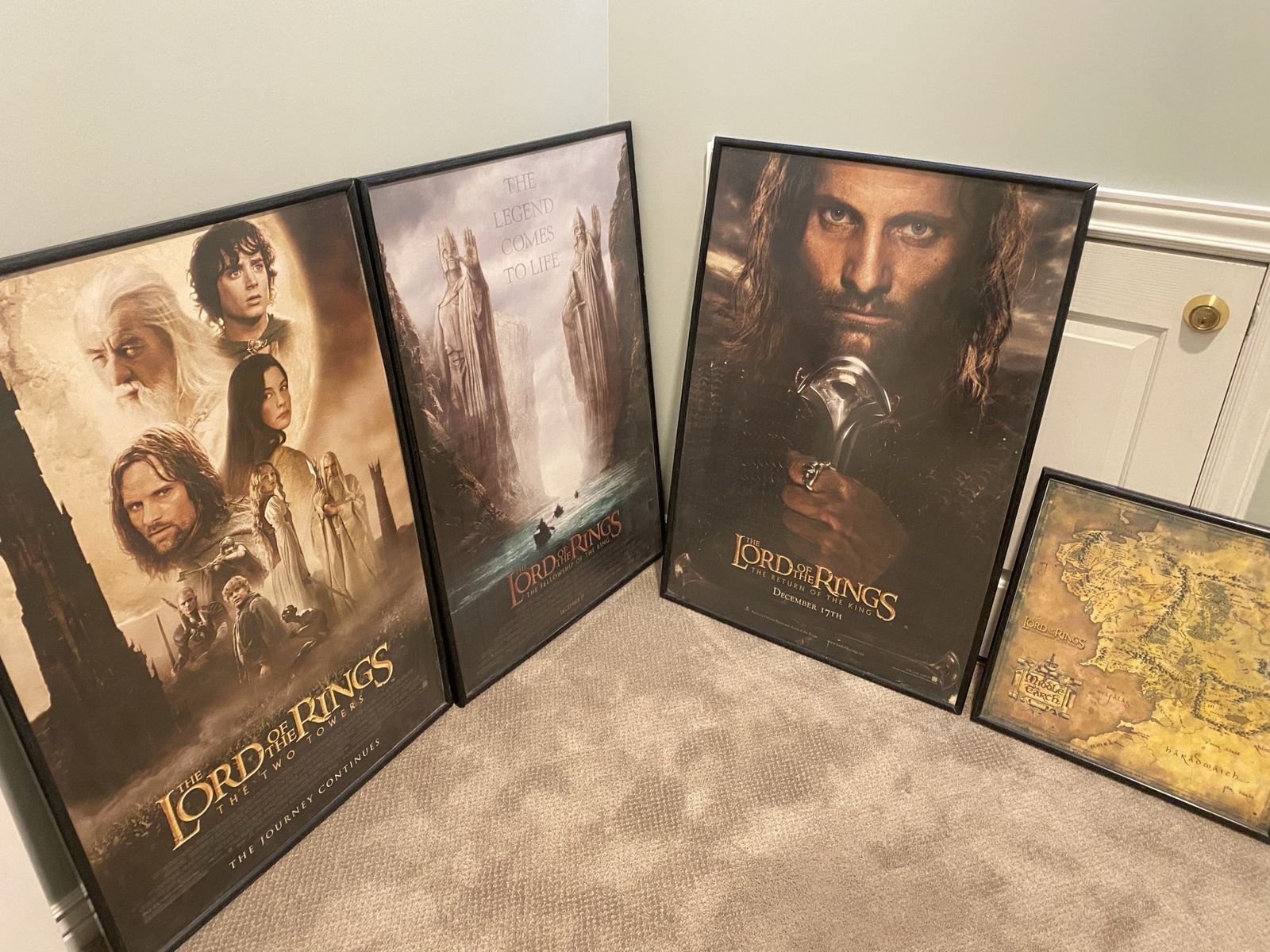 VenmoThese are theatrical release movie posters. Called one sheets, they have the reversed image on the back for being displayed in a light box. Fellowship and Two towers are in mint condition and have been framed since removed from the delivery tubes. Return on the king is damaged from a theft attempt. I’m including a framed map of middle earth as well.
