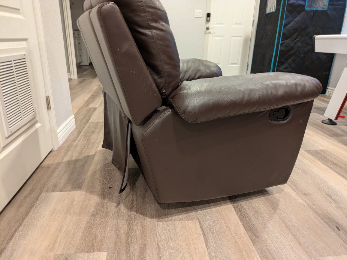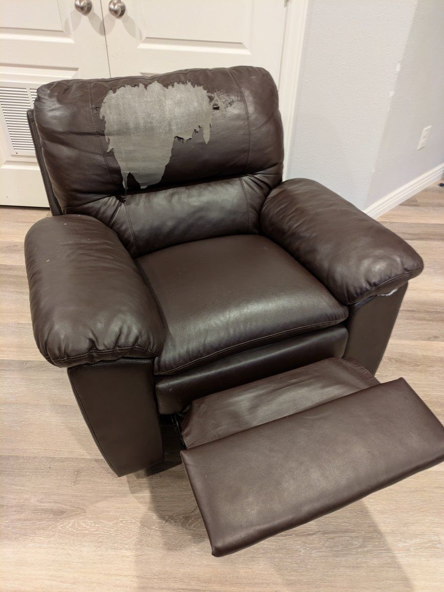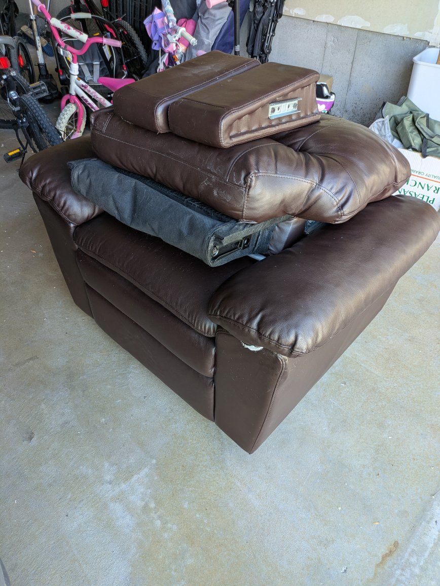 FREE Non-rocking recliner that works great, just had some cosmetic wear. You could easily get a cover for it from Amazon and it'll have new life. We disassembled it to make it easier to transport and move through doors, but it's very easy to reassemble. You must be able to load it and haul it away.