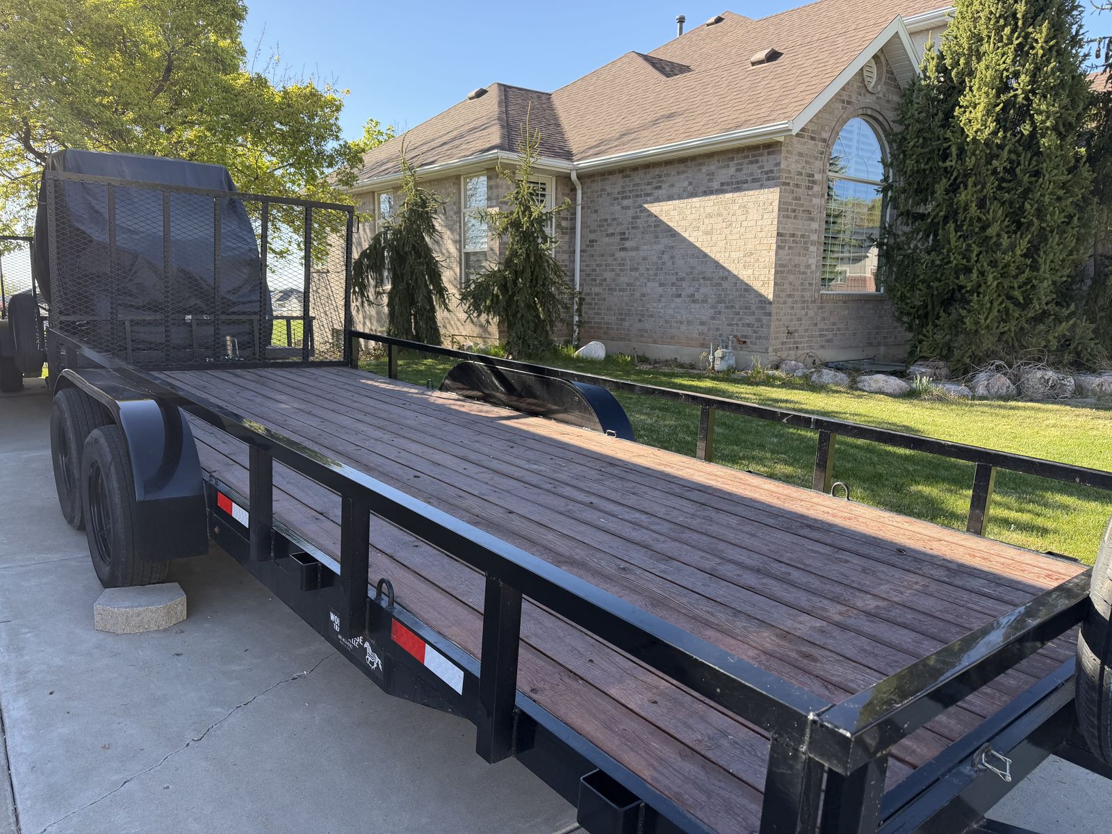 Venmo2023 Workhorse 7x18 ft tandem axle trailer. Hauling capacity GVWR 7000 lbs. Used very little, like new condition, good tires with spare tire. 5 Heavy Duty weld on tie downs. Rear ramp 5 ft. Electric brakes. Treated sealed deck bed.