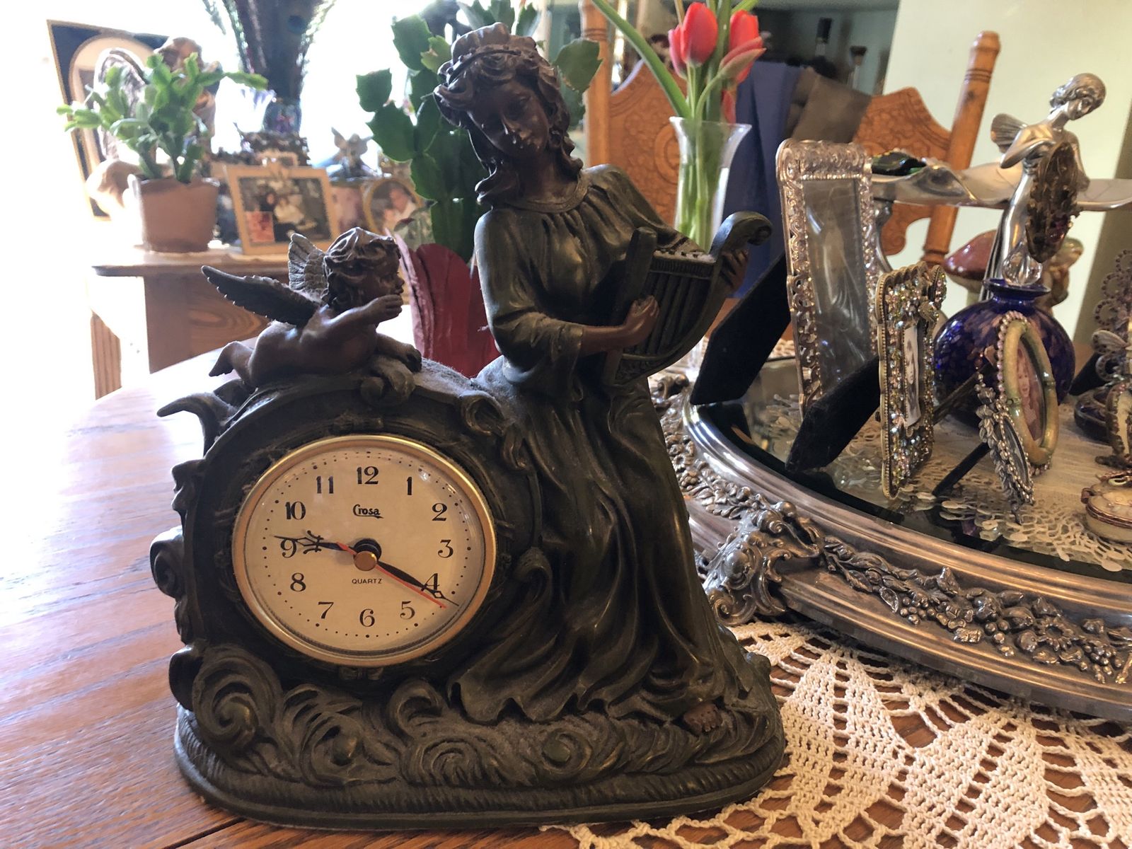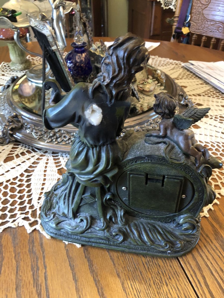 Resin clock with angel has some damage in the back a little on the side but still really nice. If you put it against something you can’t see the back.