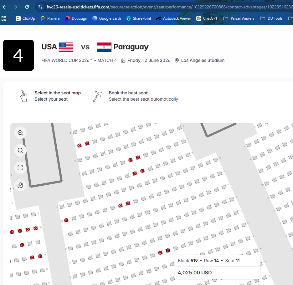 Two (2) tickets to USA's opening match in Los Angeles against Paraguay at SoFi Stadium. Section 519 row 15 seats 18 & 19 (CAT 2 tickets).